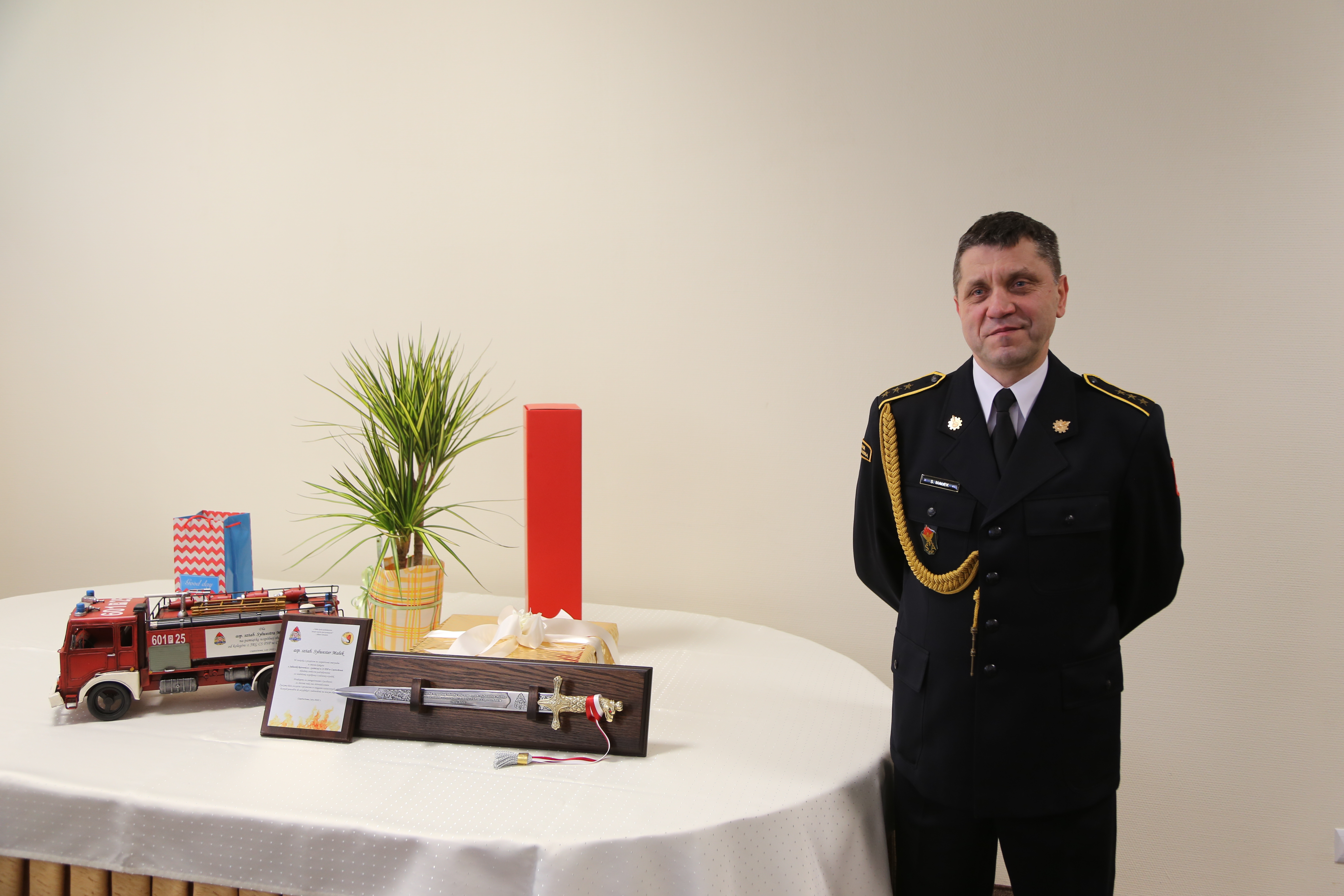 Pełniąc służbę w Centralnej Szkole PSP asp. sztab. Sylwester Małek dał się poznać jako wybitny strażak, sumienny pracownik, godny zaufania człowiek. Jego postawa, ofiarna i rzetelna służba oraz pełne zaangażowanie w realizację powierzonych zadań są godne naśladowania. Brał czynny udział w rozbudowie całej infrastruktury Centralnej Szkoły. Dziękując za ofiarną służbę, życzono naszemu koledze, aby dalsze dni dawały poczucie dobrze spełnionego obowiązku oraz przynosiły wiele nowych, pozytywnych doświadczeń życiowych.