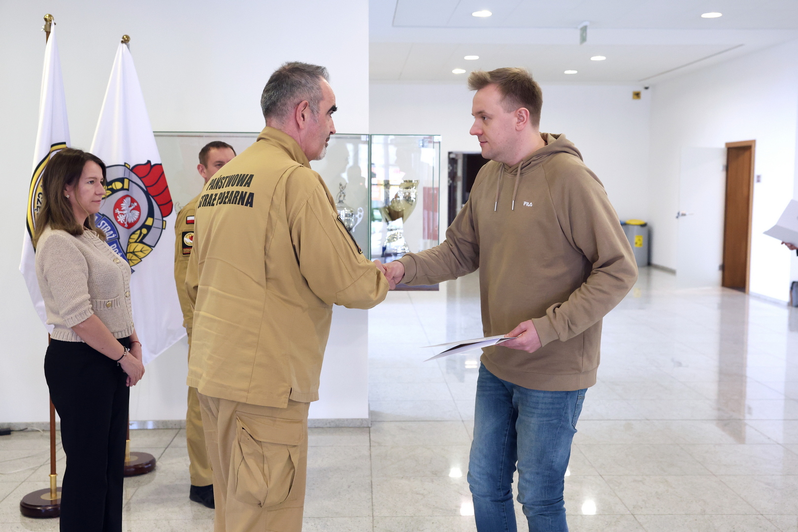 Zaświadczenia przedłużające uprawnienia inspektora ochrony przeciwpożarowej wręczył Zastępca Komendanta Centralnej Szkoły Państwowej Straży Pożarnej st. bryg. Piotr Woś w obecności Naczelnika i Zastępcy Wydziału Szkoleń Specjalistycznych i Współpracy Międzynarodowej - st. bryg. Bogumiła Zalewskiego oraz mł. bryg. Arkadiusza Omazdy.