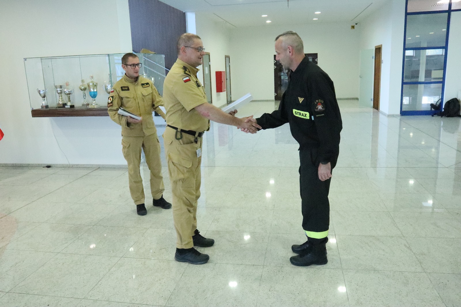 W uroczystości zakończenia udział wziął i wręczył stosowne zaświadczenia Zastępca Komendanta Centralnej Szkoły PSP bryg. Tomasz Bąk w obecności Zastępcy Naczelnika Wydziału Szkoleń Specjalistycznych i Współpracy Międzynarodowej: mł. bryg. Arkadiusza Omazdy.