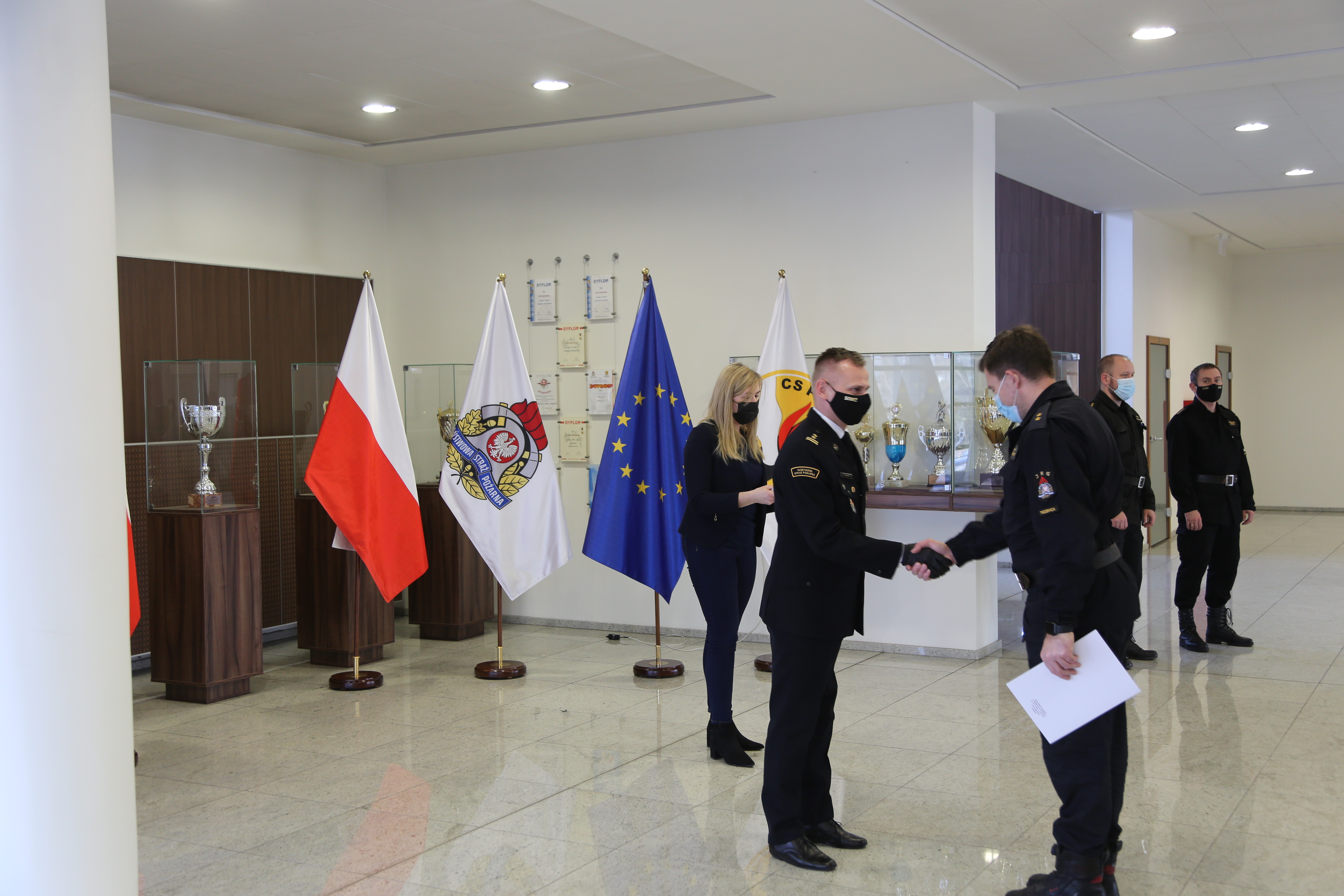 Na zakończenie wszyscy uczestnicy otrzymali zaświadczenia o ukończeniu przedmiotowego szkolenia. Zaświadczenia uczestnikom szkolenia wręczył Zastępca Komendanta Centralnej Szkoły PSP w Częstochowie bryg. Damian Hajdas w obecności, Naczelnika Wydziału Informatyki i Łączności – bryg. Krzysztofa Kopka, Zastępcy Naczelnika Wydziału Szkoleń Specjalistycznych i Współpracy Międzynarodowej – st. kpt. Arkadiusza Omazda oraz kierownika szkolenia – st. kpt. Kamila Piotrowskiego.