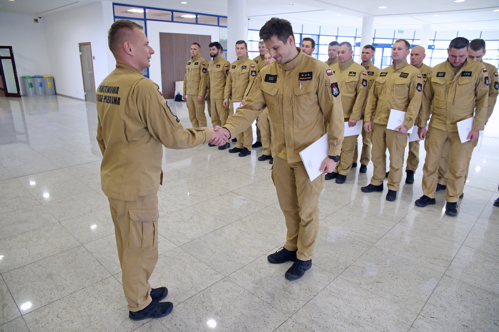 Zaświadczenia uczestnikom szkolenia wręczył Zastępca Komendanta Centralnej Szkoły PSP w Częstochowie st. bryg. dr inż. Damian Hajdas w obecności Naczelnika Wydziału Szkoleń Specjalistycznych i Współpracy Międzynarodowej - st. bryg. Bogumiła Zalewskiego oraz kierownika szkolenia - mł. bryg. Kamila Piotrowskiego.