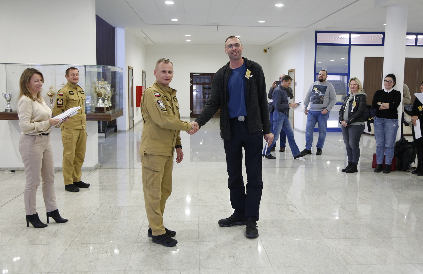 Zaświadczenia inspektora ochrony przeciwpożarowej wręczył Zastępca Komendanta Centralnej Szkoły PSP w Częstochowie st. bryg. dr Damian Hajdas w obecności Naczelnika Wydziału Szkoleń Specjalistycznych i Współpracy Międzynarodowej - st. bryg. Bogumiła Zalewskiego oraz Zastępcy Naczelnika Wydziału Szkoleń Specjalistycznych i Współpracy Międzynarodowej - mł. bryg. Arkadiusza Omazdy.