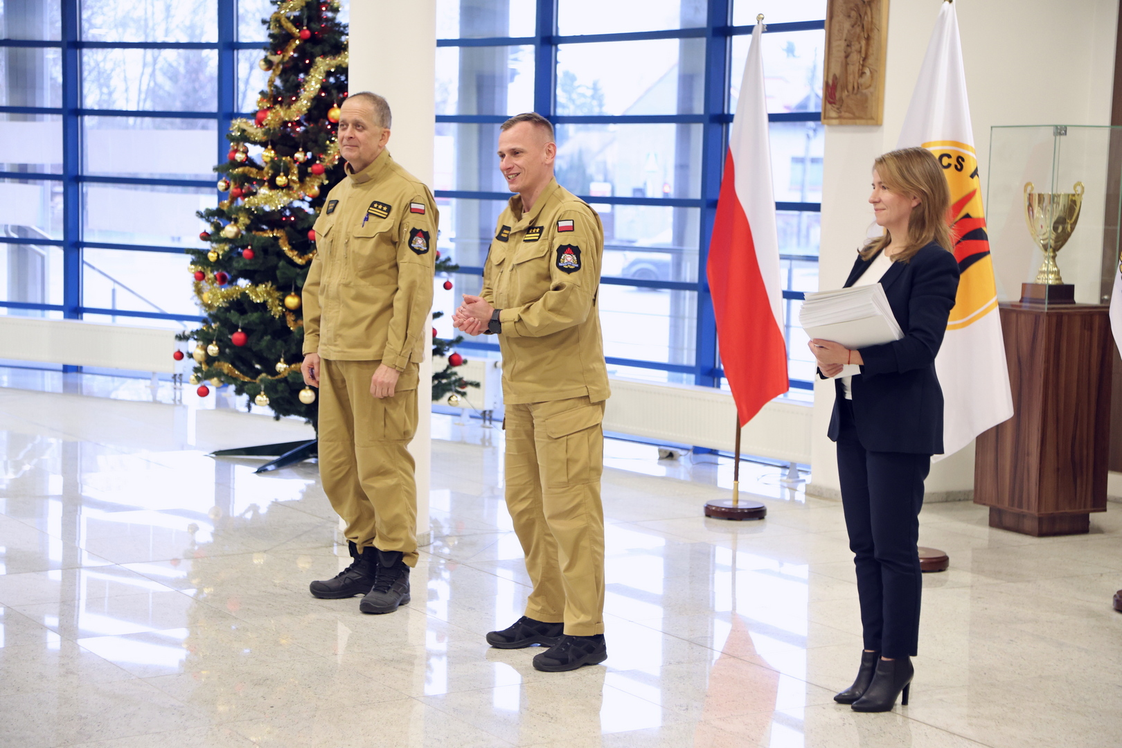 Zaświadczenia inspektora ochrony przeciwpożarowej wręczył Zastępca Komendanta Centralnej Szkoły PSP w Częstochowie st. bryg. dr Damian Hajdas w obecności Naczelnika Wydziału Szkoleń Specjalistycznych i Współpracy Międzynarodowej - st. bryg. Bogumiła Zalewskiego.
