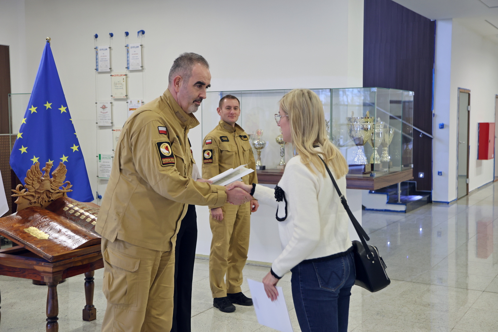 Zaświadczenia inspektora ochrony przeciwpożarowej wręczył Zastępca Komendanta Centralnej Szkoły PSP w Częstochowie st. bryg. Piotr Woś w obecności przedstawicieli Wydziału Szkoleń Specjalistycznych i Współpracy Międzynarodowej: Naczelnika - st. bryg. Bogumiła Zalewskiego oraz Zastępcy Naczelnika - mł. bryg. Arkadiusza Omazdy.
