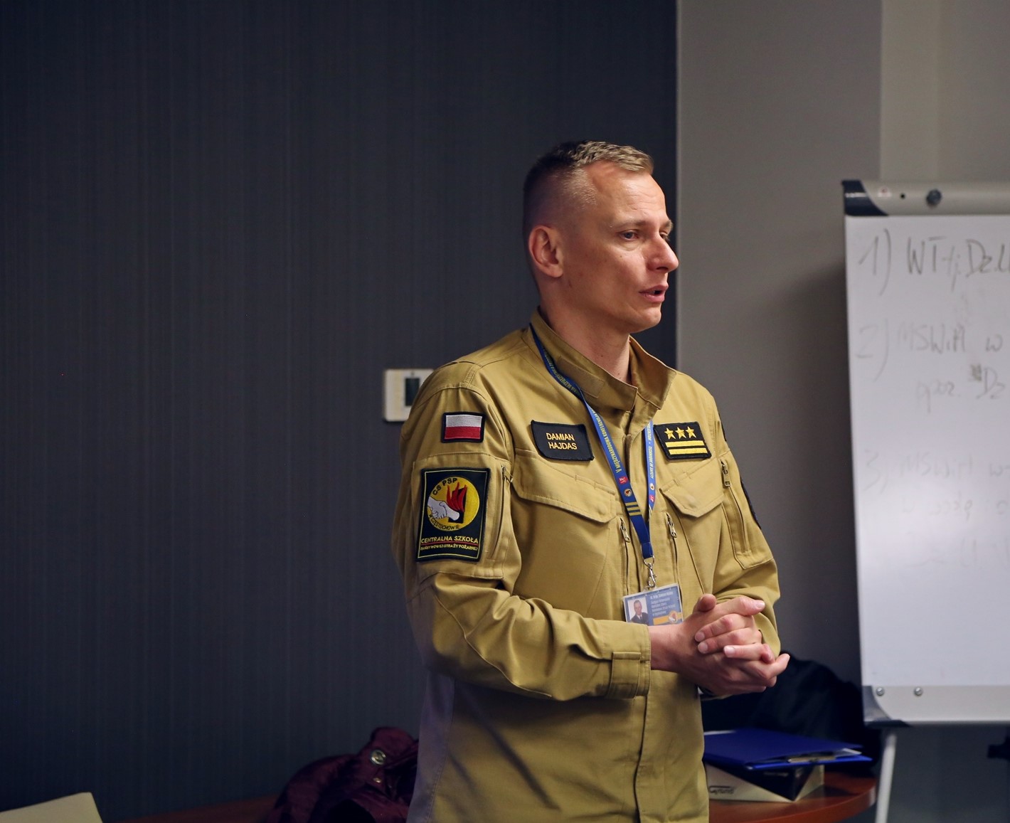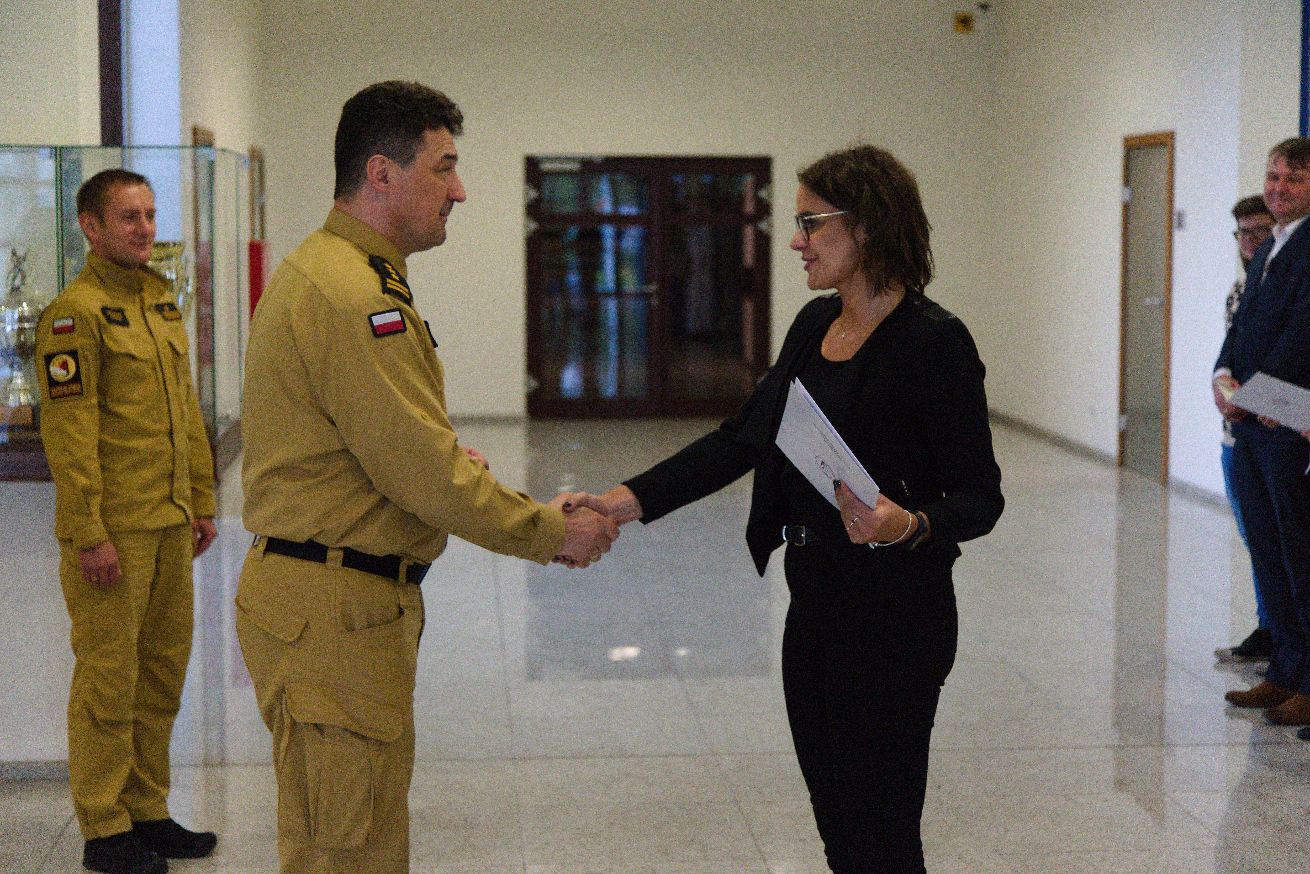 Zaświadczenia inspektora ochrony przeciwpożarowej wręczył Komendant Centralnej Szkoły PSP w Częstochowie st, bryg. Piotr Placek w obecności przedstawicieli Wydziału Szkoleń Specjalistycznych i Współpracy Międzynarodowej: Naczelnika - st. bryg. Bogumiła Zalewskiego oraz Zastępcy Naczelnika - mł. bryg. Arkadiusza Omazdy.