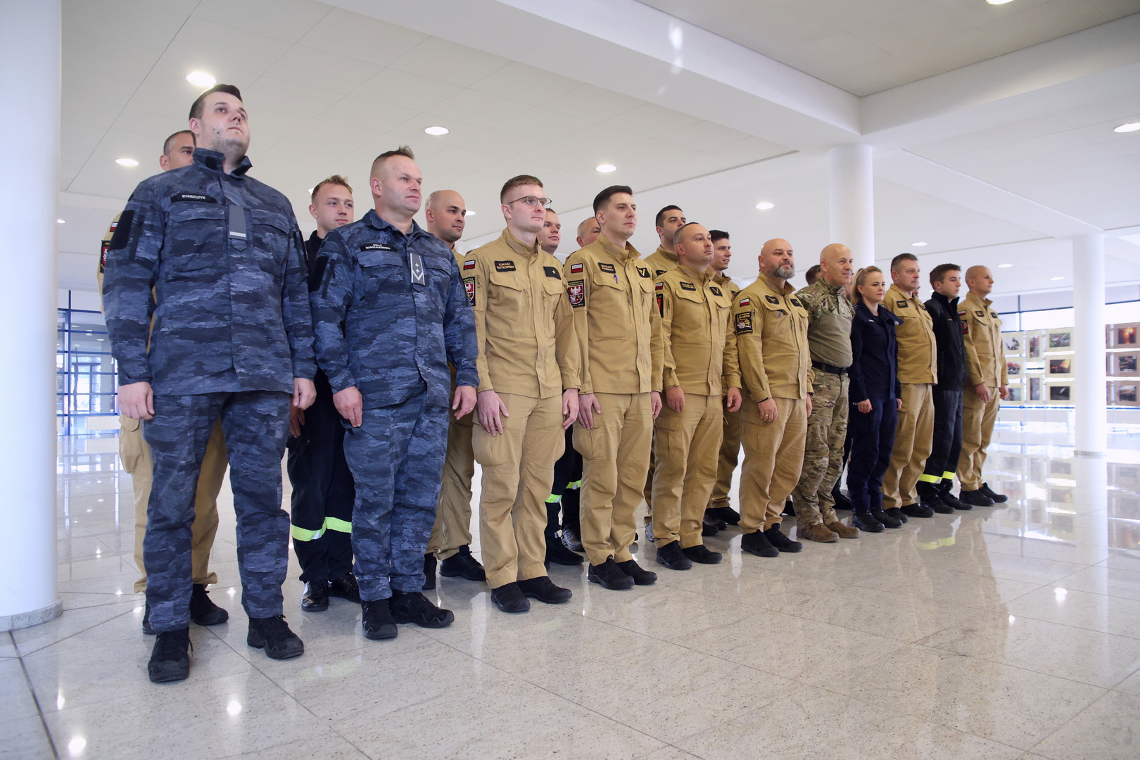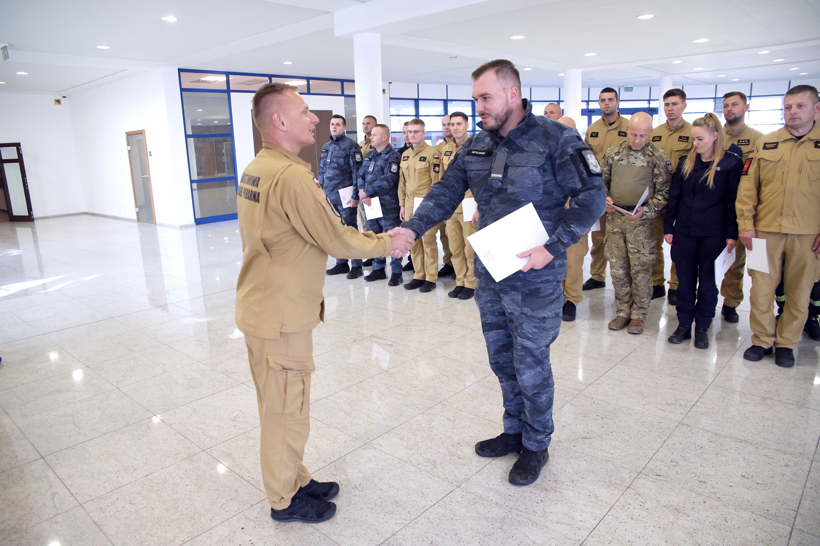 Zaświadczenia uczestnikom szkolenia wręczył Zastępca Komendanta Centralnej Szkoły PSP w Częstochowie st. bryg. dr Damian Hajdas w obecności: st. bryg. Bogumiła Zalewskiego -Naczelnika Wydziału Szkoleń Specjalistycznych i Współpracy Międzynarodowej, st. kpt. Artura Wydry – Kierownika Zespołu Przedmiotowego i kierownika powyższego szkolenia oraz wykładowcy mł. kpt. Kamila Biały.