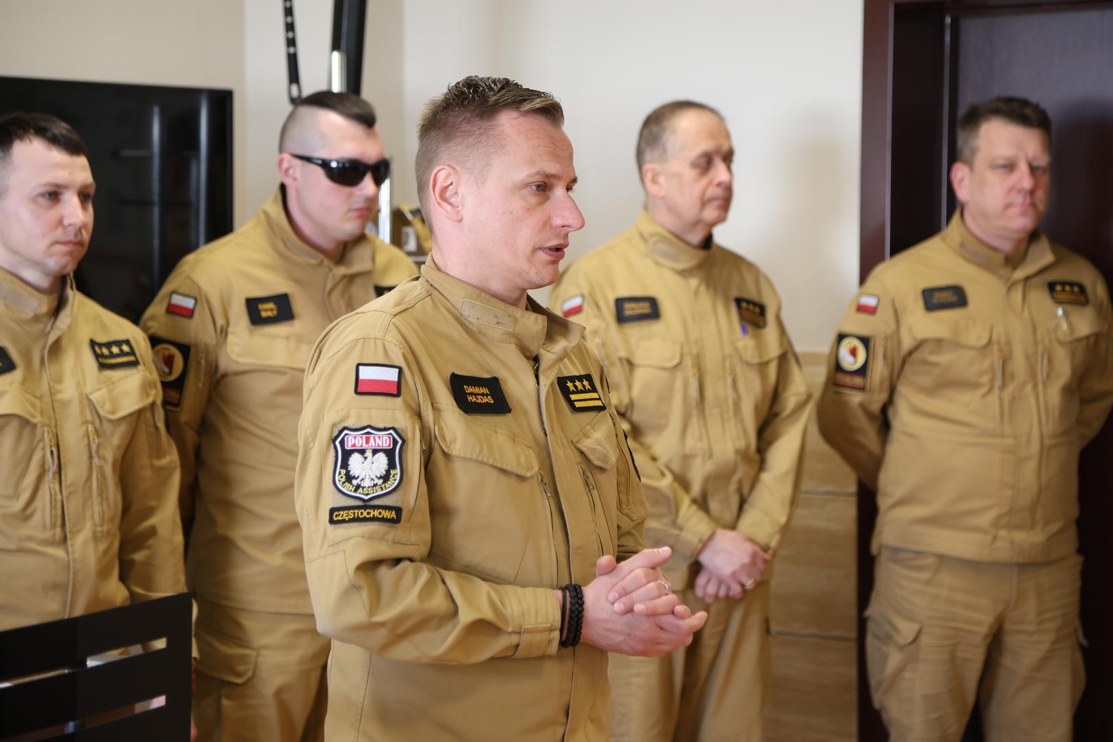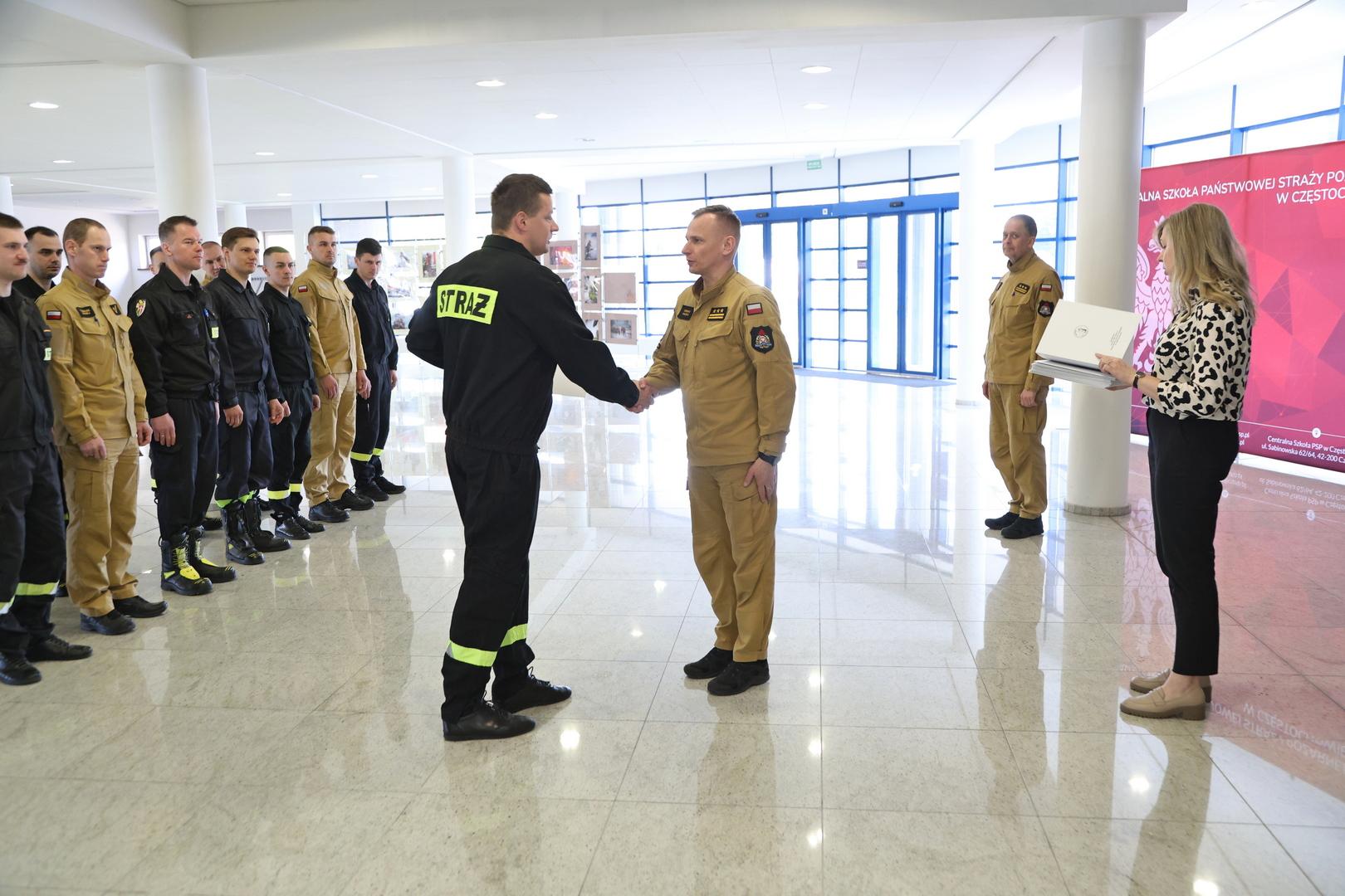 Zaświadczenia uczestnikom szkolenia wręczył Zastępca Komendanta Centralnej Szkoły PSP w Częstochowie st. bryg. dr Damian Hajdas w obecności: st. bryg. Bogumiła Zalewskiego - Naczelnika Wydziału Szkoleń Specjalistycznych i Współpracy Międzynarodowej, st. kpt. Artura Wydry - Kierownika Zespołu Przedmiotowego i kierownika powyższego szkolenia oraz wykładowcy mł. kpt. Kamila Biały.