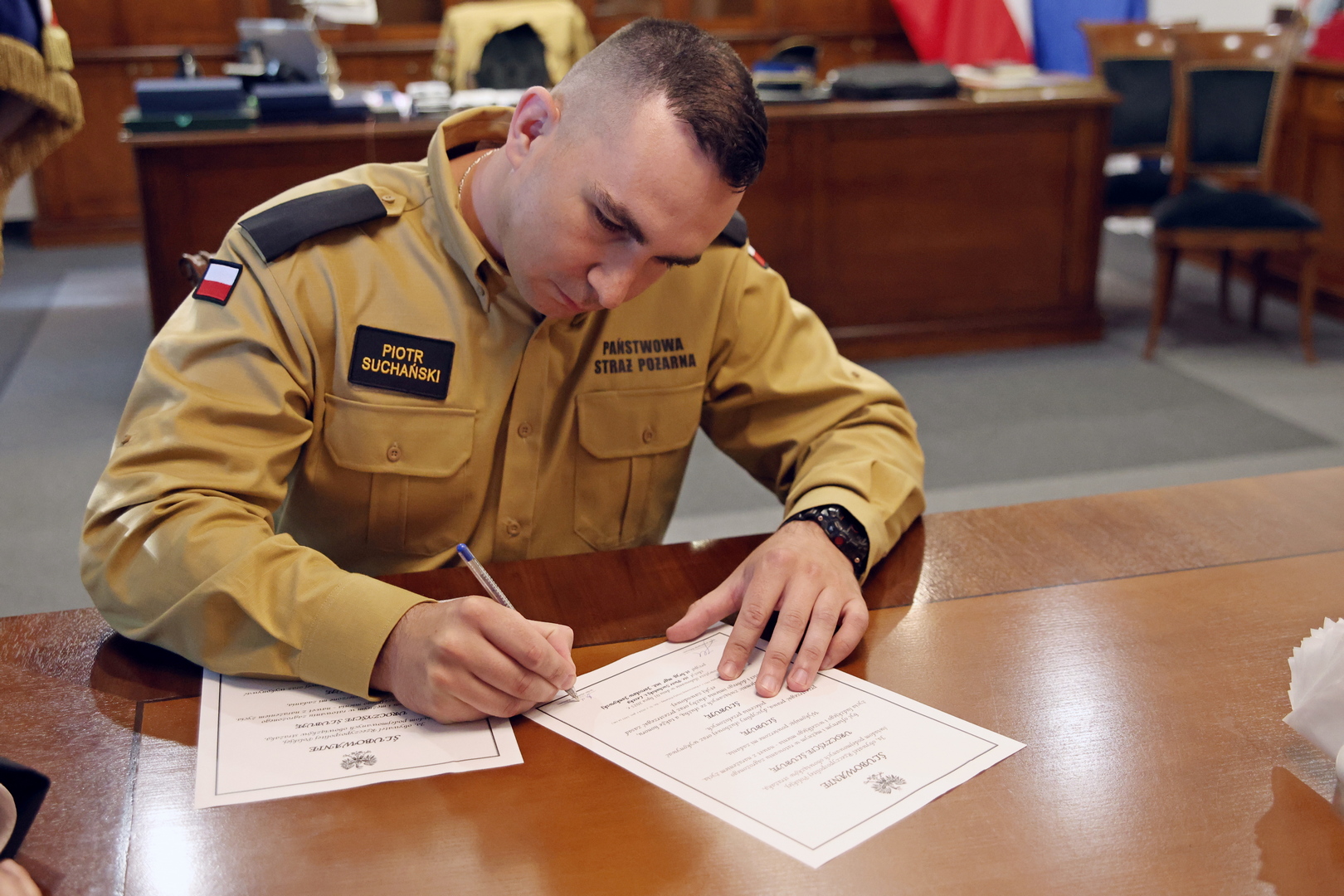 Strażakowi Piotrowi Suchańskiemu życzymy powodzenia i witamy w szeregach Państwowej Straży Pożarnej.