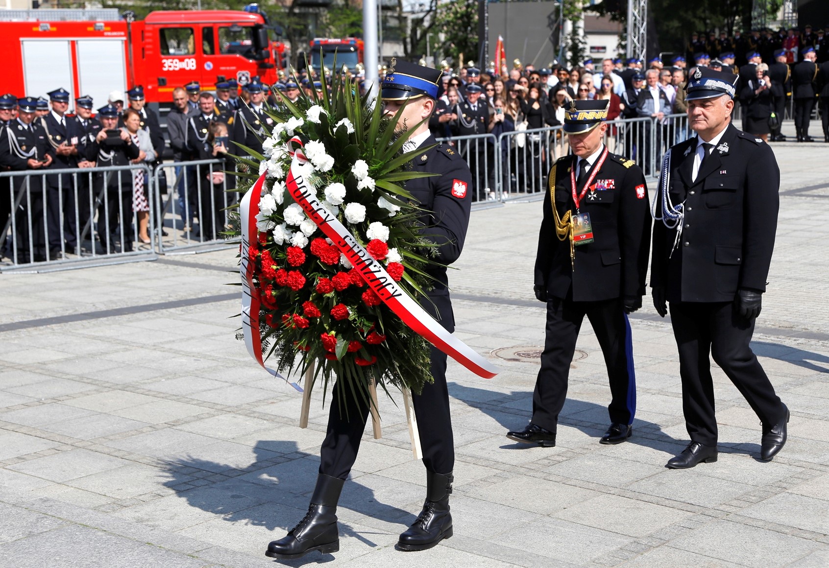 Wieniec w imieniu narodu Polskiego i Polskich Strażaków pod pomnikiem Marszałka złożyli także Komendant Główny PSP gen. brygadier Andrzej Bartkowiak wraz z Prezesem ZG ZOSP RP druhem Waldemarem Pawlakiem.