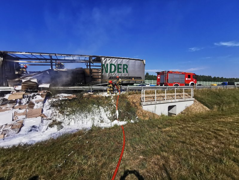 Zastępy JOP zostały zadysponowane do zdarzenia pod adresem jak w treści zgłoszenia. Po przyjeździe na miejsce zdarzenia KDR dokonał rozpoznania, w wyniku którego ustalił, że pożarem objęta jest tylna część naczepy przewożącej papier. Przed przybyciem zastępów JOP kierowca ciągnika siodłowego odczepił naczepę, by ratować pojazd przed pożarem. Przeprowadzono rozpoznanie pod kątem COVID-19 - stwierdzono brak zagrożenia. KDR zdecydował o podaniu 1 prądu gaśniczego wody oraz 1 piany w natarciu na palącą się naczepę.