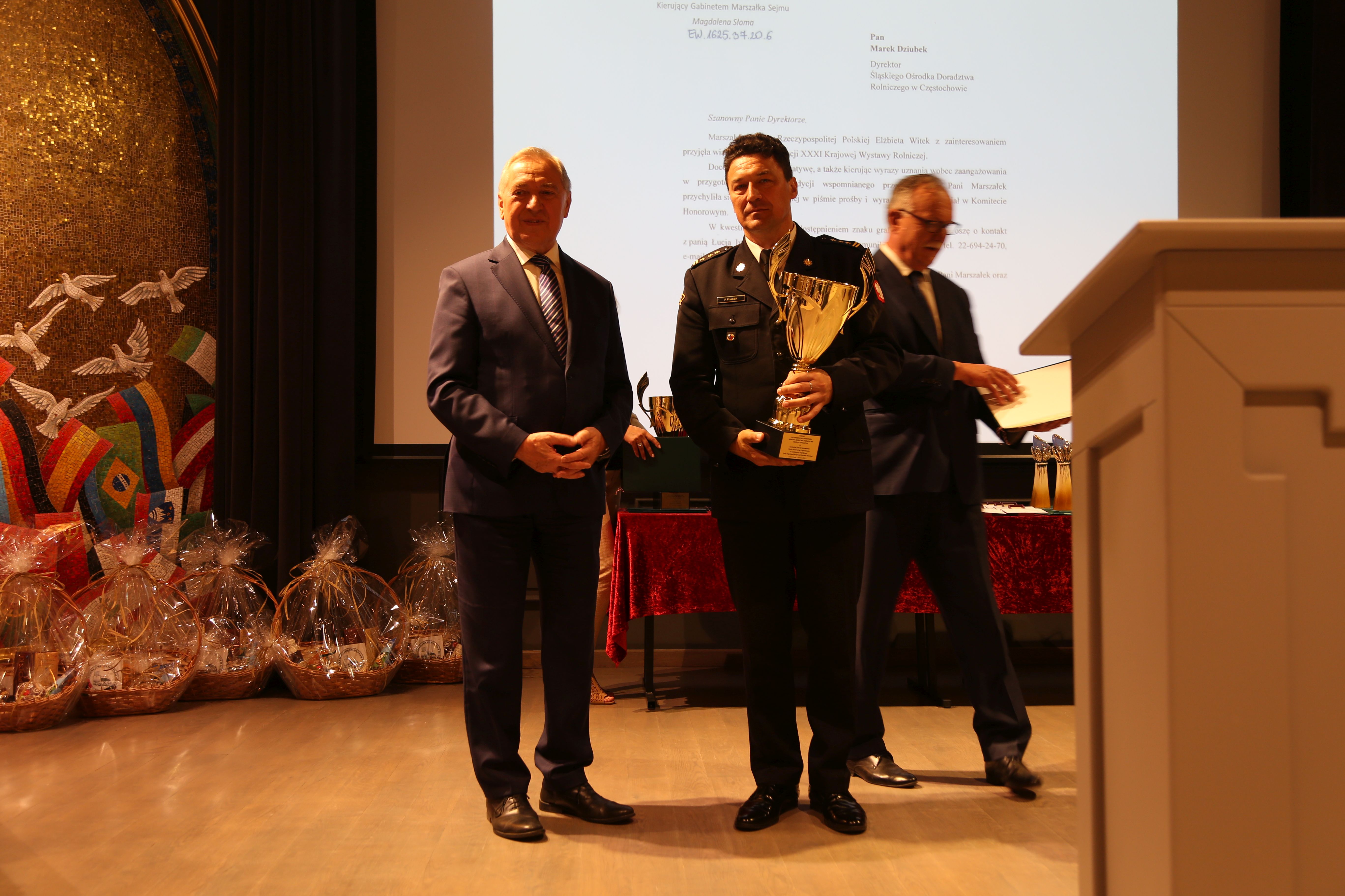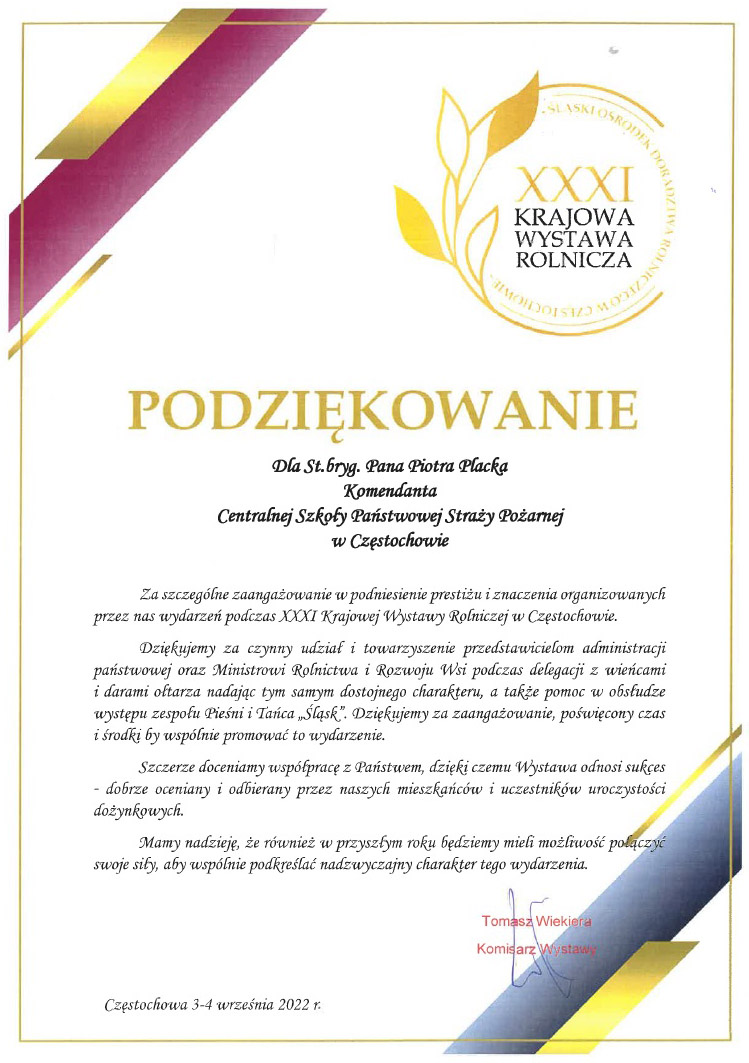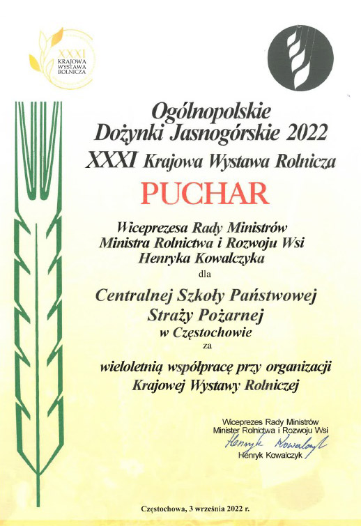 Kadeci z Centralnej Szkoły zapewnili pomoc w organizacji uroczystości oraz wsparcie medyczne. Komendant Centralnej Szkoły PSP w Częstochowie st. bryg. Piotr Placek otrzymał wyróżnienie Wiceprezesa Rady Ministrów - Ministra Rolnictwa i Rozwoju Wsi Pana Henryka Kowalczyka za wieloletnią pomoc przy organizacji Krajowej Wystawy Rolniczej dla Centralnej Szkoły PSP w Częstochowie.