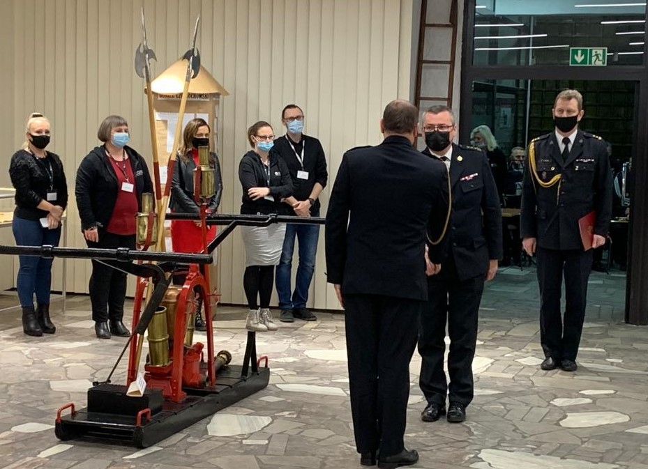 Dyrektor Archiwum Elżbieta Surma-Jończyk, Zastępca Komendanta Wojewódzkiego Państwowej Straży Pożarnej w Katowicach st. bryg. Mirosław Synowiec i Komendant Miejski Państwowej Straży Pożarnej w Częstochowie bryg. Marek Radosz oraz Zastępca Komendanta Centralnej Szkoły PSP w Częstochowie bryg. Damian Hajdas uroczyście otworzyli wystawę za pomocą jednego z eksponatów - dzwonu alarmowego z 1918 roku!