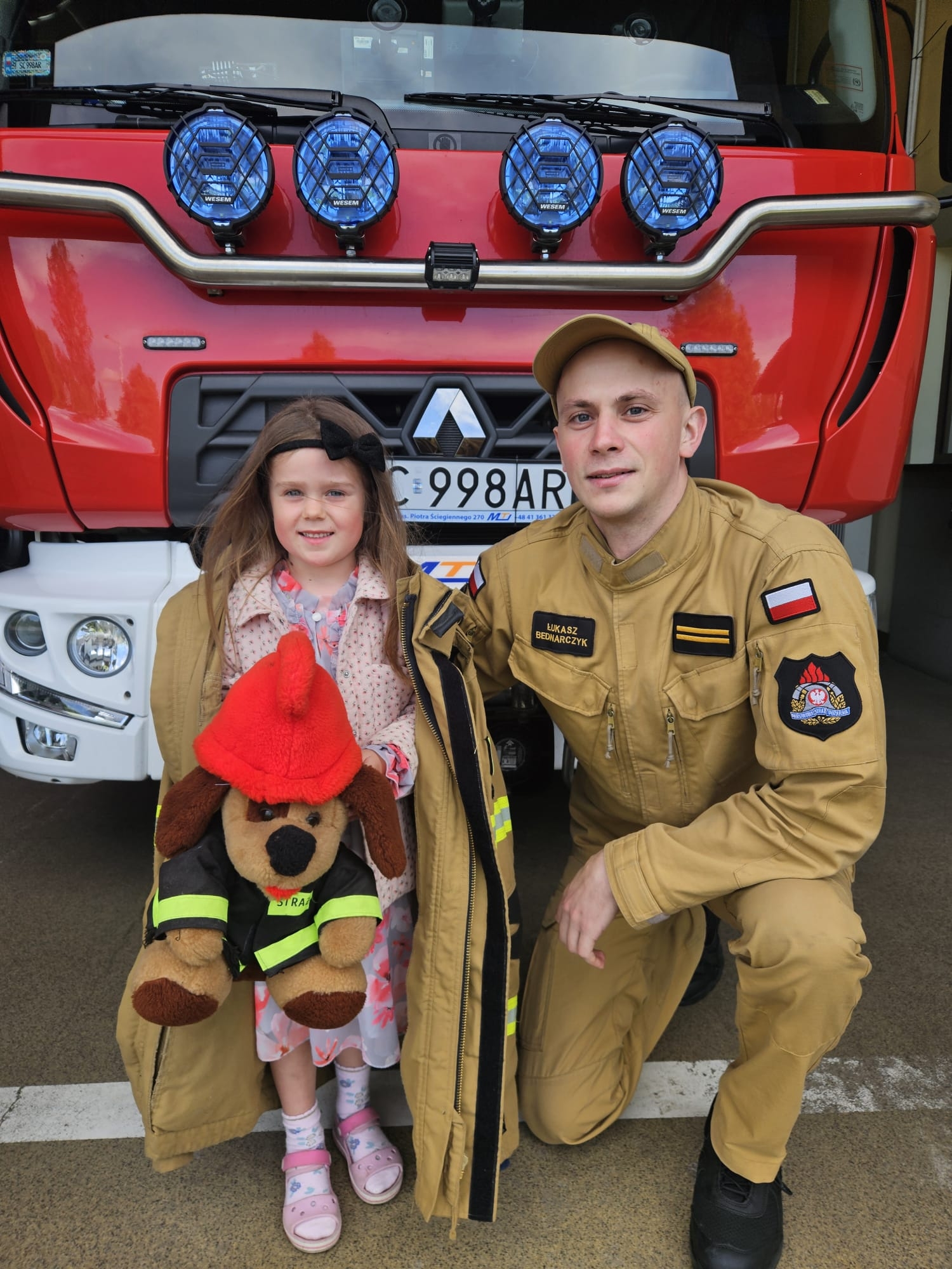 Niedzielne popołudnie w Dniu Strażaka było idealnym momentem do wspólnego spotkania, wyrażenia wdzięczności, przekazania upominków, a także poznania miejsca pełnienia służby przez strażaków z Centralnej Szkoły. Antosia w dowód wdzięczności narysowała dla Łukasza laurkę, a w zamian otrzymała maskotkę strażacką. Gest małej Antoniny jest jednym z najpiękniejszych sposobów okazania wdzięczności i docenia pracy strażaków, za który bardzo dziękujemy. Na koniec spotkania Antosia powiedziała, że ona też zostanie w przyszłości strażakiem :)