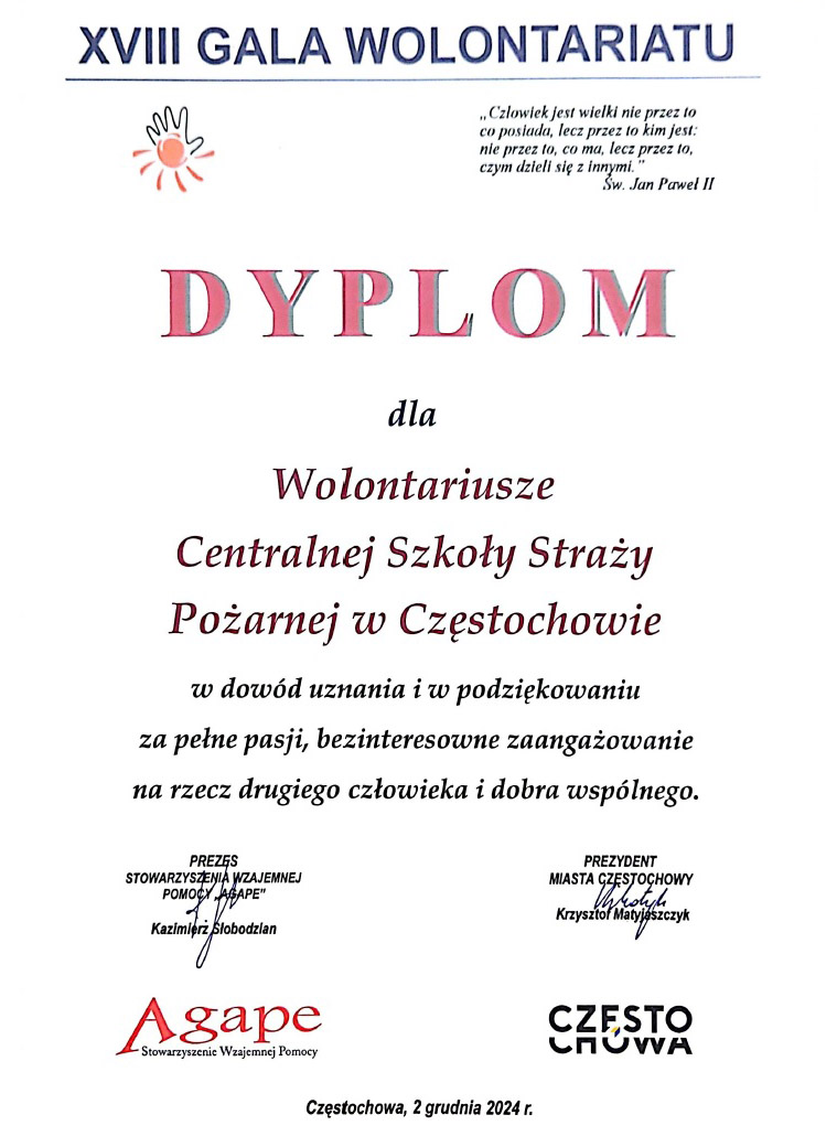 Dnia 2 grudnia 2024 r. o godzinie 17:00 odbyła się XVIII Gala Wolontariatu w Muzeum Monet i Medali, im. Jana Pawła II w Częstochowie, w której Centralna Szkoła Państwowej Straży Pożarnej w Częstochowie została wyróżniona w kategorii IV „Wolontariat Grupowy”.