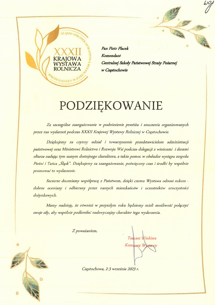 Śląski Ośrodek Doradztwa Rolniczego w Częstochowie oraz Krajowe Duszpasterstwo Rolników zaprosili Centralną Szkołę PSP w Częstochowie do pomocy w organizacji pokazów rolniczych jak i dożynek prezydenckich. Strażacy z Centralnej Szkoły zapewnili m.in. dyżur medyczny, brali udział w ceremonii jej otwarcia oraz zapewnili wartę honorową pod Epitafium Smoleńskim, gdzie gospodarze wydarzenia i wszyscy zaproszeni goście oraz Komendant Centralnej Szkoły PSP w Częstochowie st. bryg. Piotr Placek wraz ze swoim Zastępcą bryg. Tomaszem Bąkiem, złożyli hołd ofiarom które zginęły w katastrofie w dniu 10 kwietnia 2010 r.