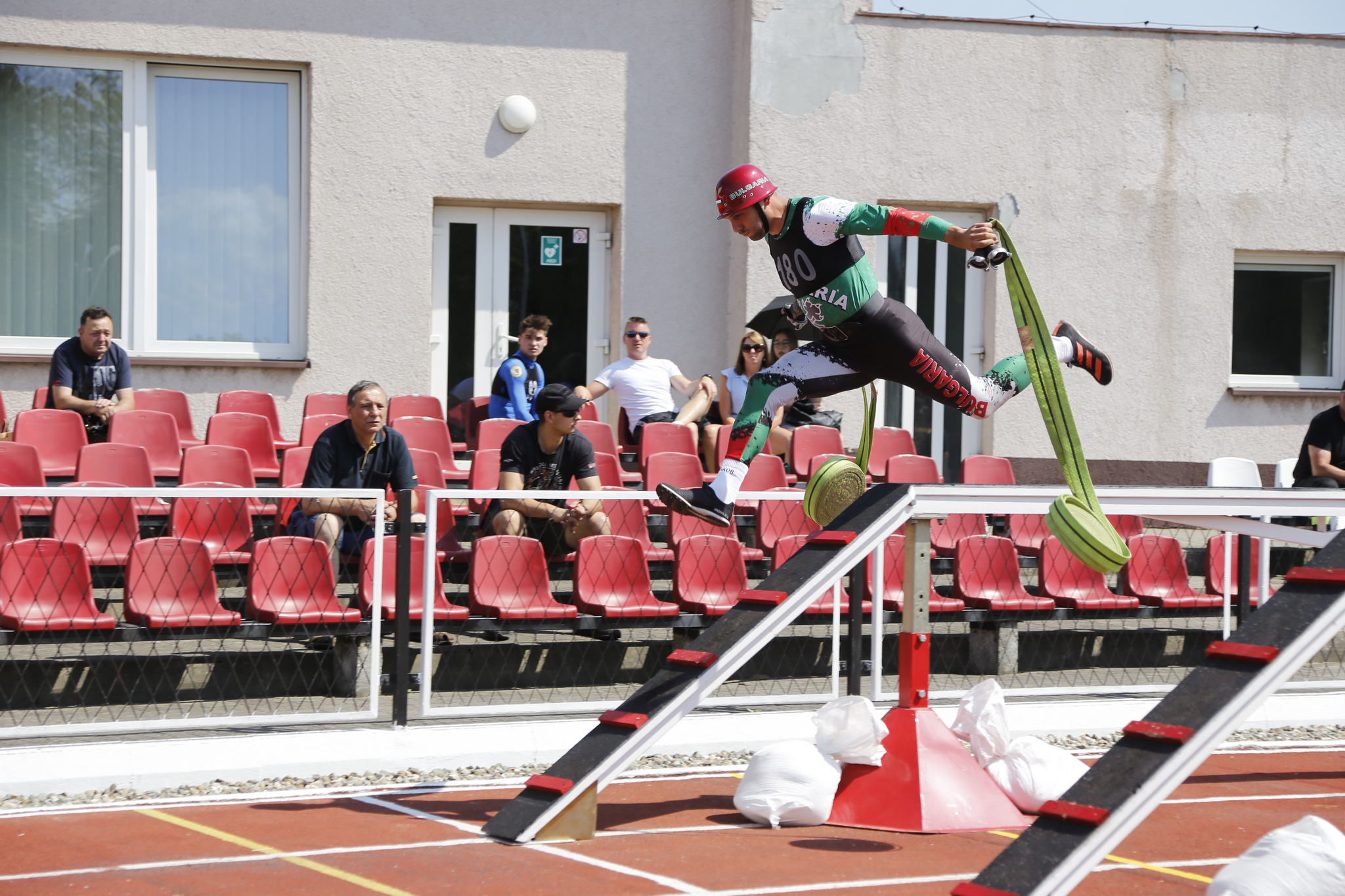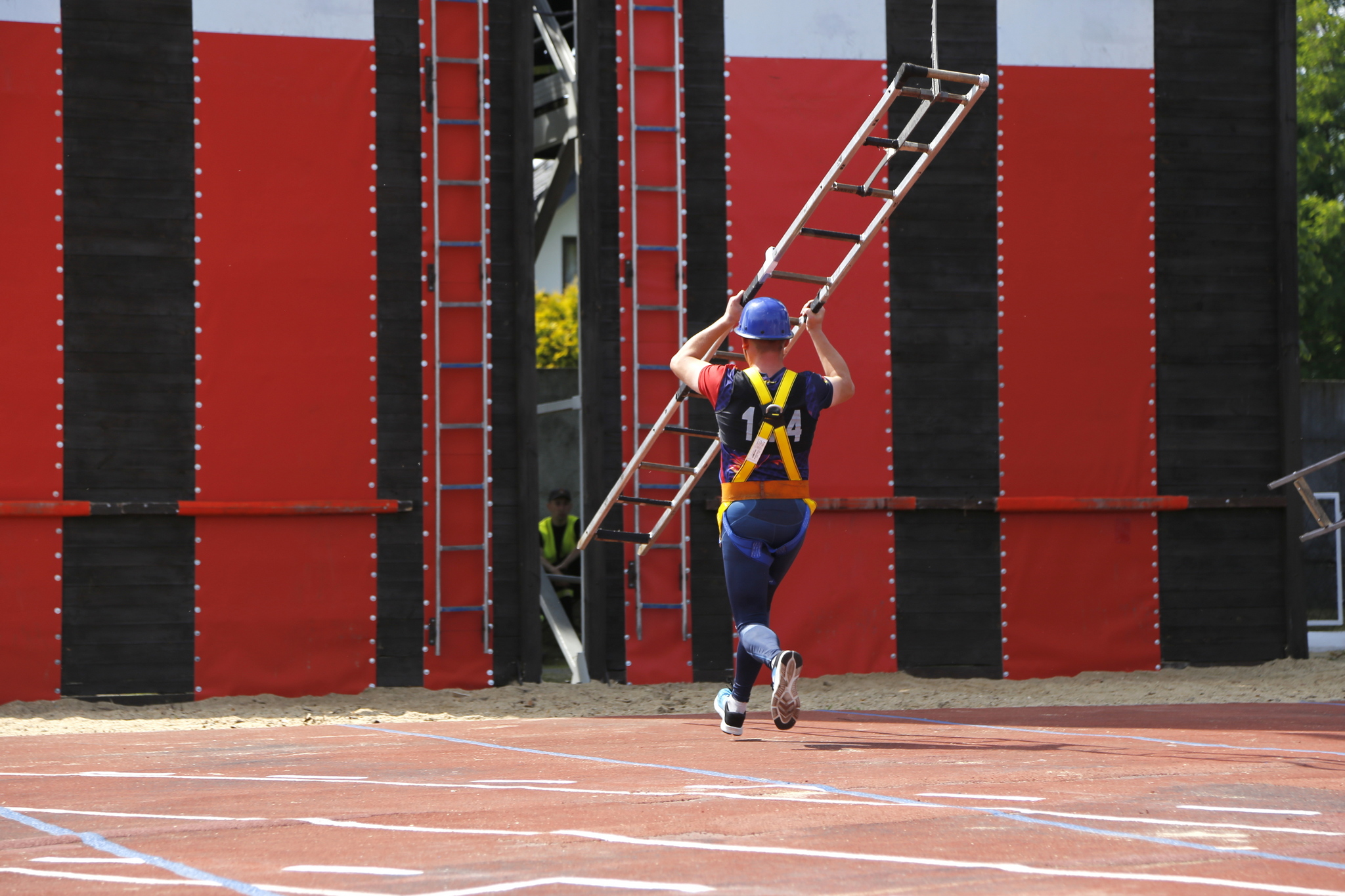 Zawodnik trzymając drabinę hakową, dobiega do wspinalni i zacinając drabinę o parapet okna na poszczególnych piętrach, wspina się na trzecie piętro.