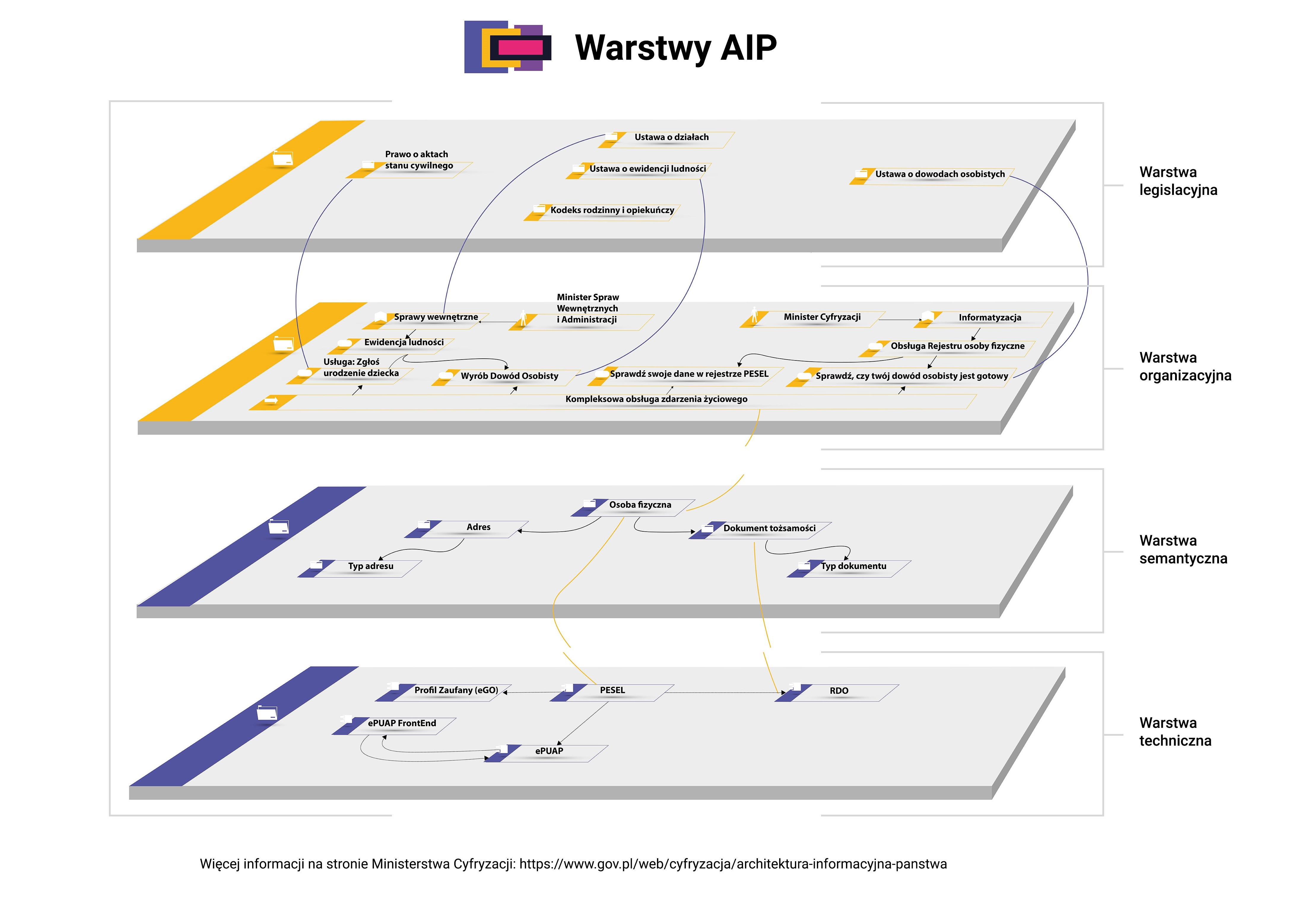 To szerokie, całościowe podejście nazywamy Architekturą Informacyjną Państwa. W resorcie cyfryzacji działa grupa kompetencyjna AIP. Zajmuje się ona tworzeniem wizji architektury, modeli, standardów i dokumentowaniem stanu obecnego, co jest podstawą planowania rozwoju oraz zapewniania spójności działań informatyzacyjnych podejmowanych przez różne instytucje. AIP nie zajmuje się projektowaniem poszczególnych systemów - to bowiem dzieje się w ramach projektów informatycznych, tworzy jednak ramy dzięki którym projekty te są ze sobą spójne i prowadzą do wspólnego celu, jakim jest sprawna realizacja zadań państwa wobec obywateli.