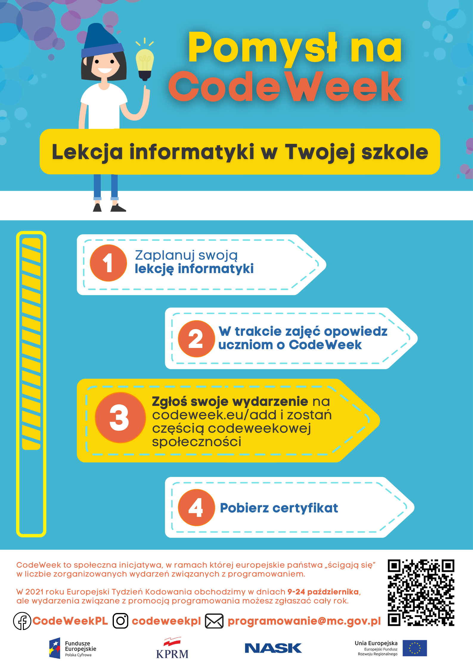 Więcej pomysłów na codeweekowe lekcje informatyki znajdziesz na stronie koduj.gov.pl i grafice „Lekcja informatyki w Twojej szkole”.