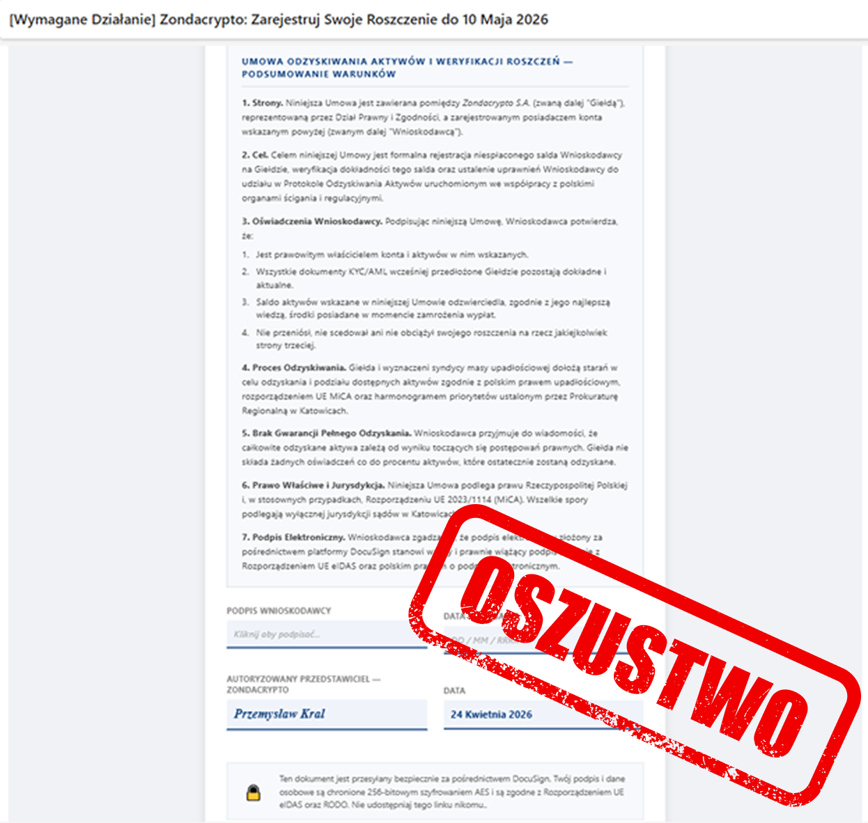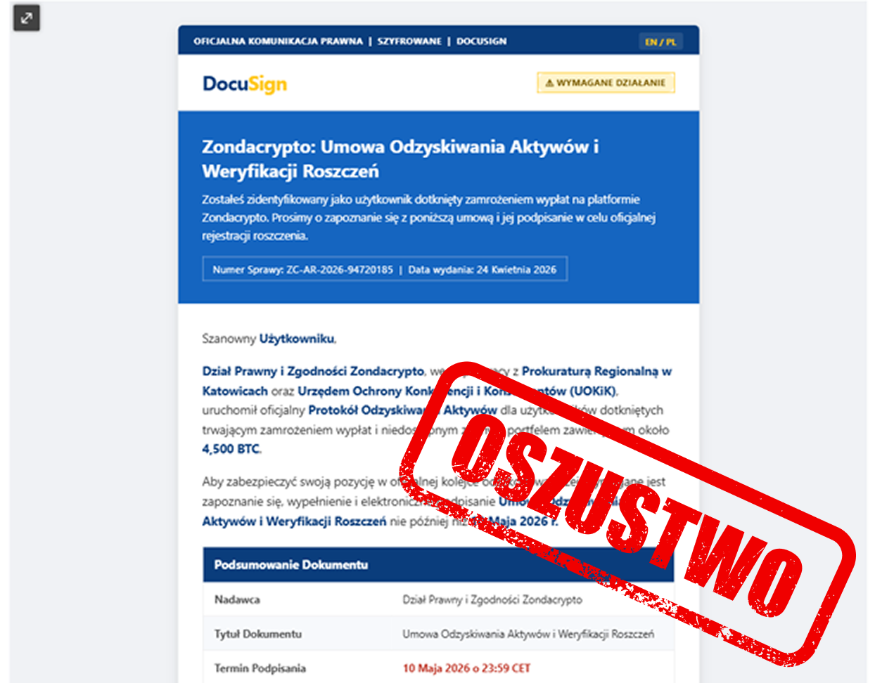 Cyberprzestępcy, wykorzystując rozgłos medialny sytuacji dot. giełdy kryptowalut, polują na poszkodowanych i kontaktują się z nimi, podszywając się pod instytucje publiczne, kancelarie prawne lub firmy oferujące pomoc w odzyskaniu środków na Zondacrypto.