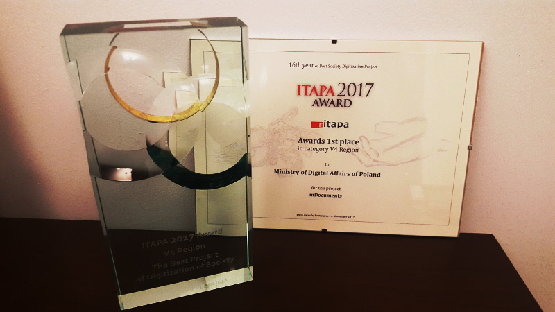 14 listopada br. w Bratysławie podczas uroczystej gali zorganizowanej z okazji Międzynarodowego Kongresu ITAPA 2017, została przyznana Ministerstwu Cyfryzacji nagroda państw V4 dla projektu mDokumenty.