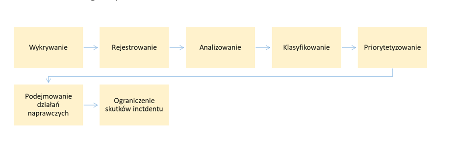 Natomiast zarządzanie incydentem obejmuje obsługę incydentu (czyli wszystkie wyżej wymienione etapy), wyszukiwanie powiązań między incydentami, usuwanie przyczyn ich wystąpienia oraz opracowywanie wniosków wynikających z obsługi incydentu.