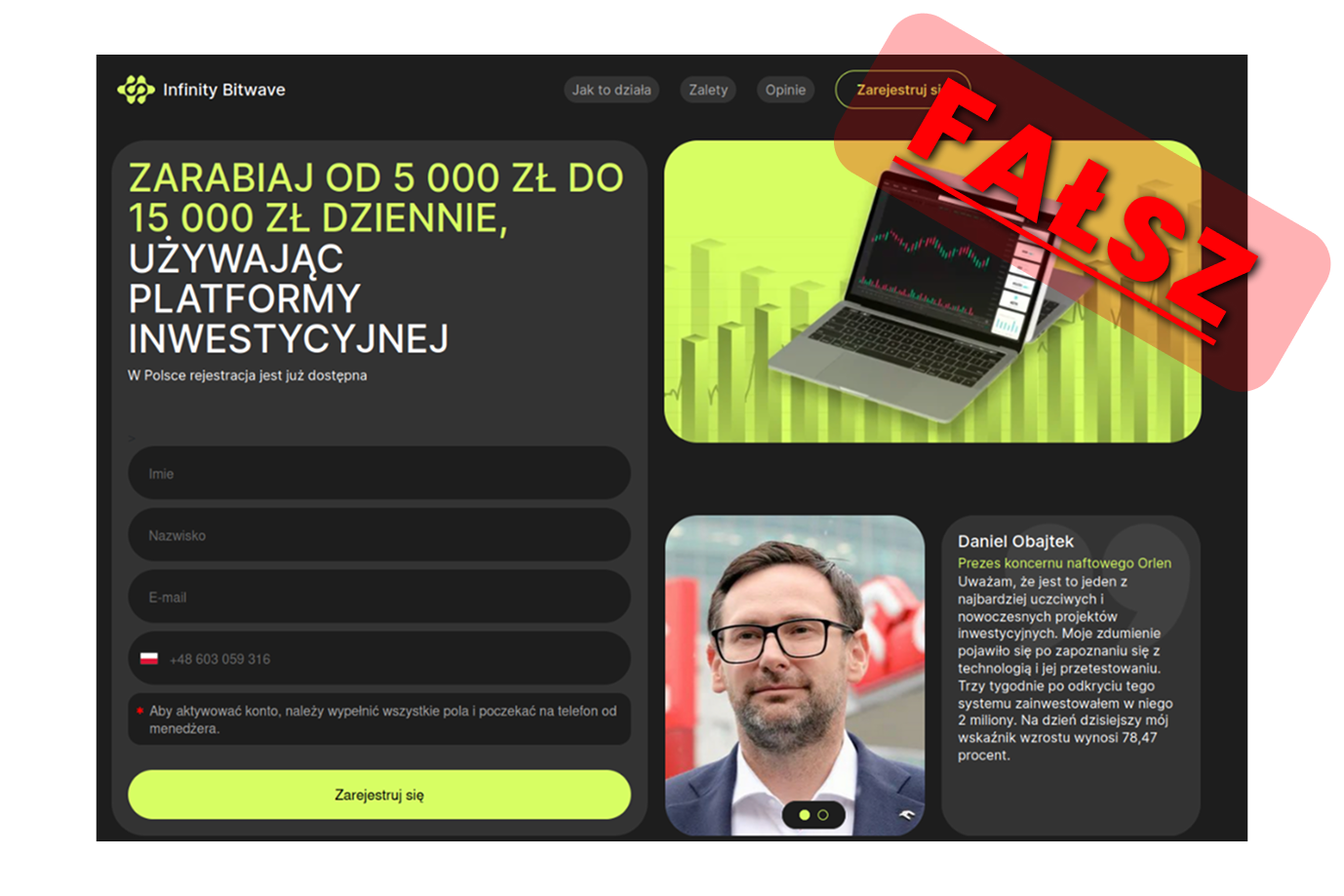 Dezinformacja to treści celowo wprowadzające w błąd. Mogą one mieć formę oszustwa, np. inwestycyjnego – które ma na celu wyłudzenie pieniędzy – lub fake newsa, czyli nieprawdziwej informacji, np. przypisywania osobom lub instytucjom fałszywych wypowiedzi. Takie treści często wykorzystują wizerunek znanych osób lub organizacji bez ich zgody w celu pozyskania zaufania odbiorcy.