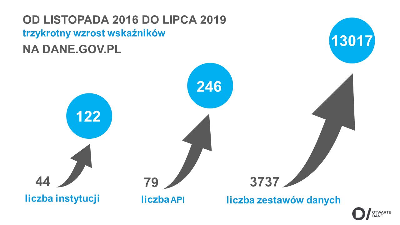 Od listopada 2016 r. liczba instytucji udostępniających dane na portalu wzrosła z 44 do 122, liczba API tj. kodów źródłowych umożliwiających wzajemną komunikację programów i tym samym tworzenie aplikacji - z 79 do 246, a liczba zestawów danych z 3737 aż do 13017!