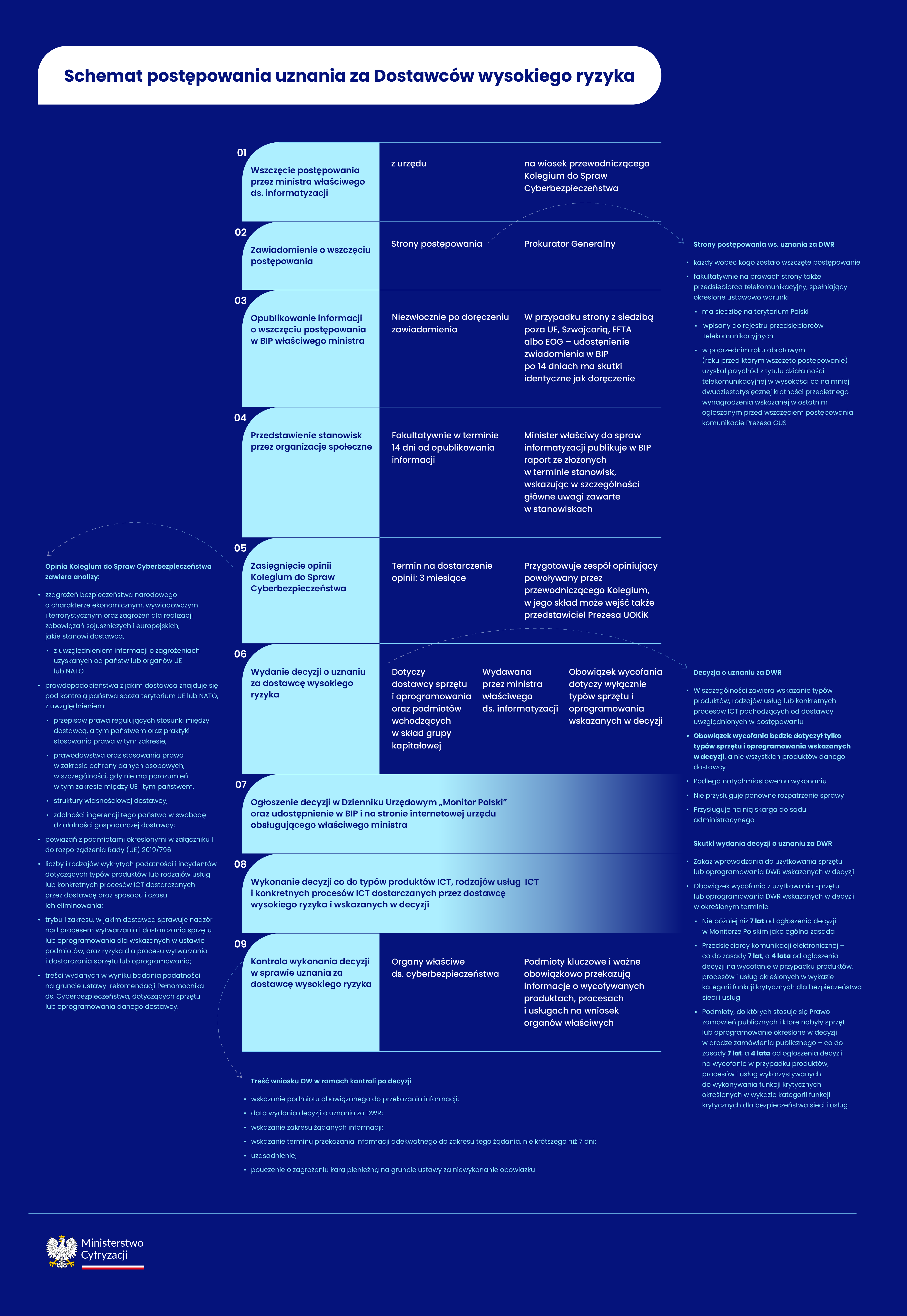 Ministerstwo Cyfryzacji wyjaśnia wątpliwości dotyczące dostawców wysokiego ryzyka. W związku z pojawiającymi się nieprawdziwymi informacjami przedstawiamy schematy, które pokazują, jak wygląda proces uznawania dostawcy za wysokiego ryzyka. Zmiany te są częścią nowego projektu ustawy o Krajowym Systemie Cyberbezpieczeństwa.