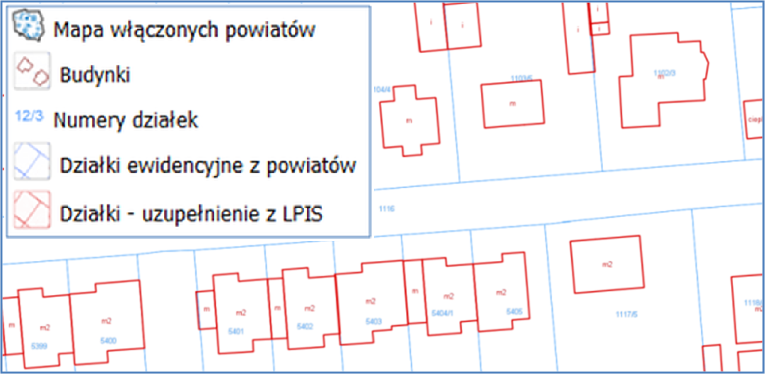 - KrajowaIntegracjaEwidencjiGruntów – najważniejsza usługa obejmująca dane ewidencji gruntów i budynków z ponad 290 powiatów. Typowy wygląd informacji publikowanej w usłudze to działki i budynki.