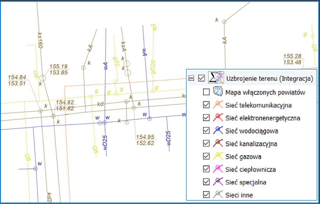 - KrajowaIntegracjaUzbrojeniaTerenu - obejmującą dane o uzbrojeniu terenu z ponad 40 powiatów. Typowy wygląd informacji w usłudze to przewody i urządzenia sieci uzbrojenia terenu.