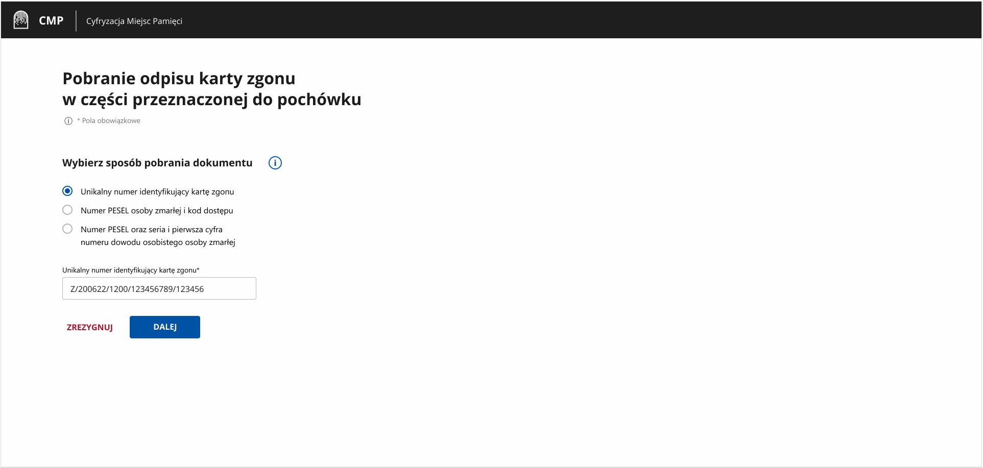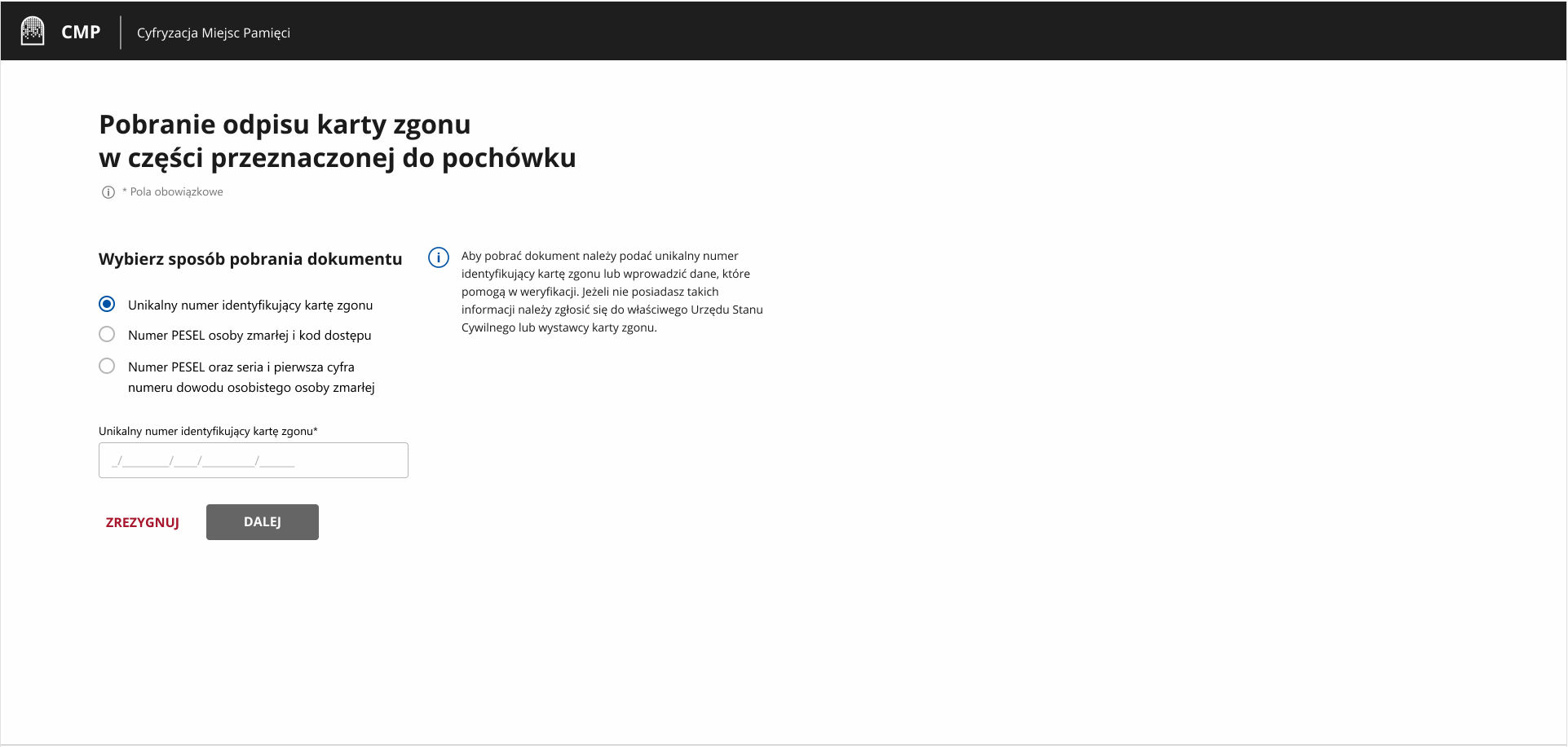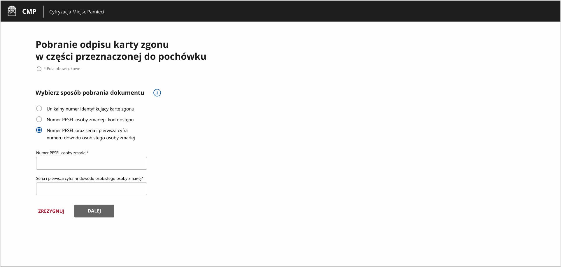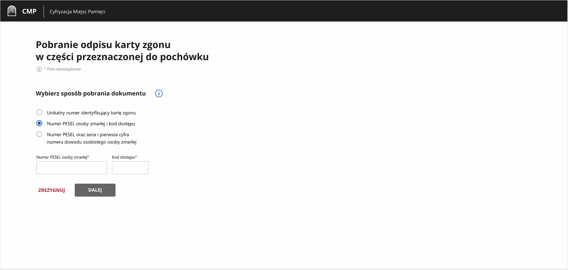 - numer PESEL osoby zmarłej i kod dostępu albo