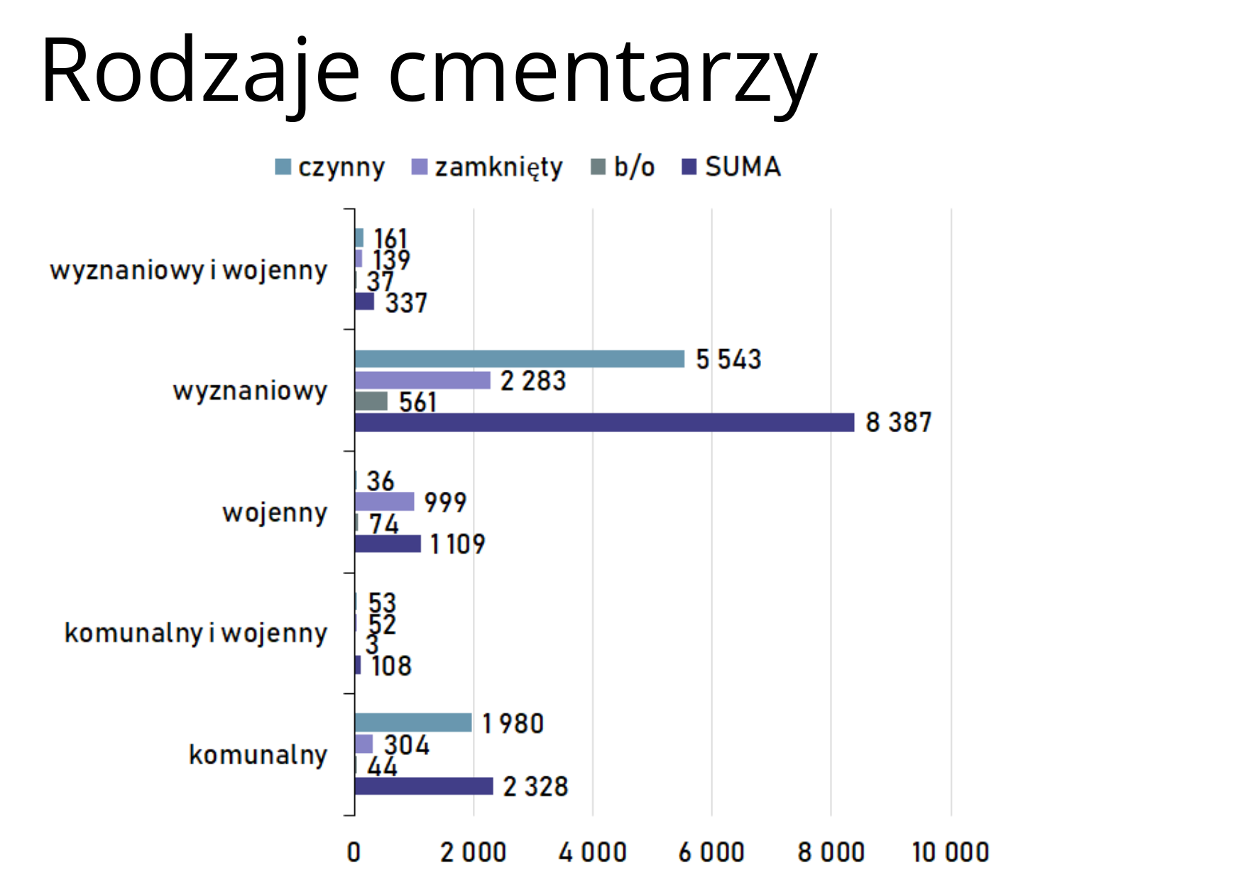 Według wyników ankiety w Polsce znajduje się 12 269 cmentarzy o łącznej powierzchni 16 077 ha. Najczększą część tej liczby stanowią cmentarze wyznaniowe (Wykres nr 1).
