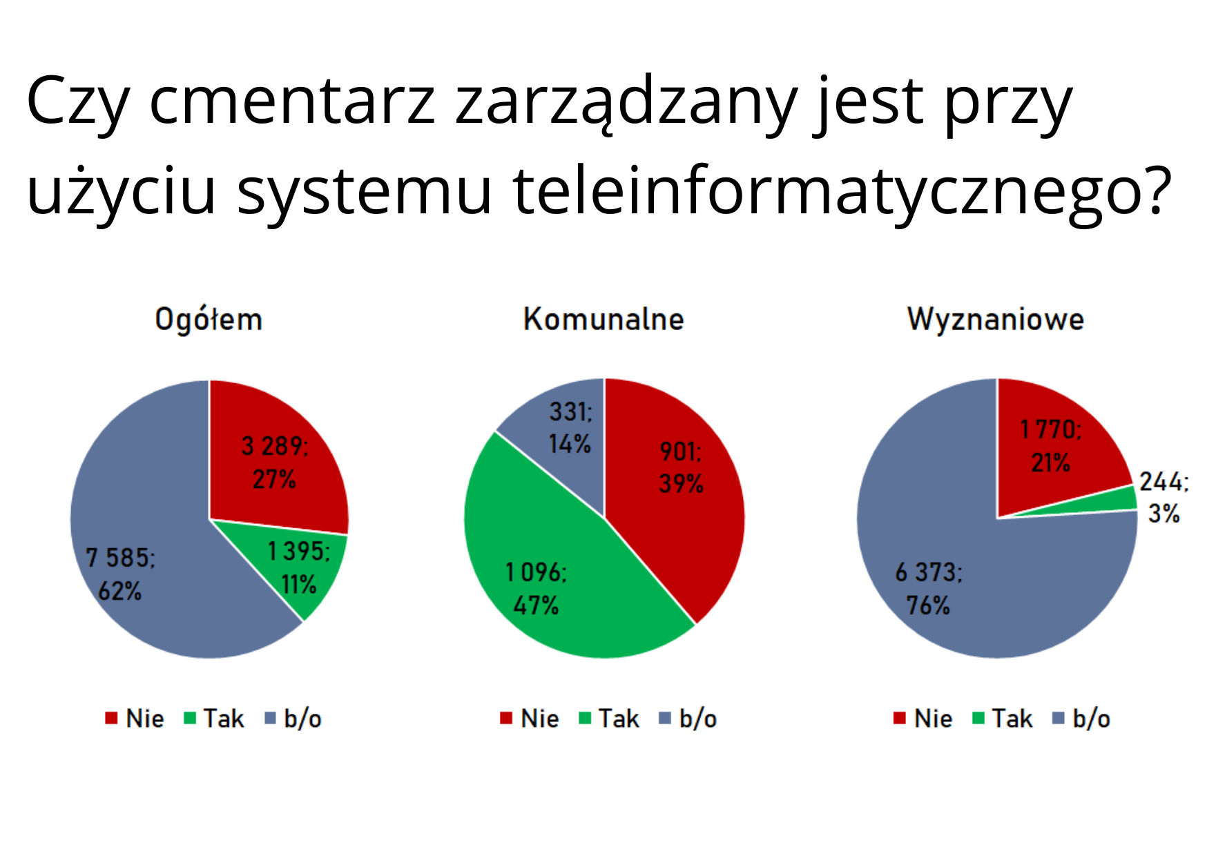Obecnie co najmniej 10% cmentarzy ogółem jest zarządzanych przy wykorzystaniu systemów teleinformatycznych, w tym ponad połowa cmentarzy komunalnych i 3% cmentarzy wyznaniowych (Wykres nr 2). Nadal istnieje co najmniej kilkadziesiąt dużych (wielohektarowych) cmentarzy, które nie zostały ucyfrowione. W większości gminy korzystają z zakupionych systemów lub usług zewnętrznych (Wykres 3).