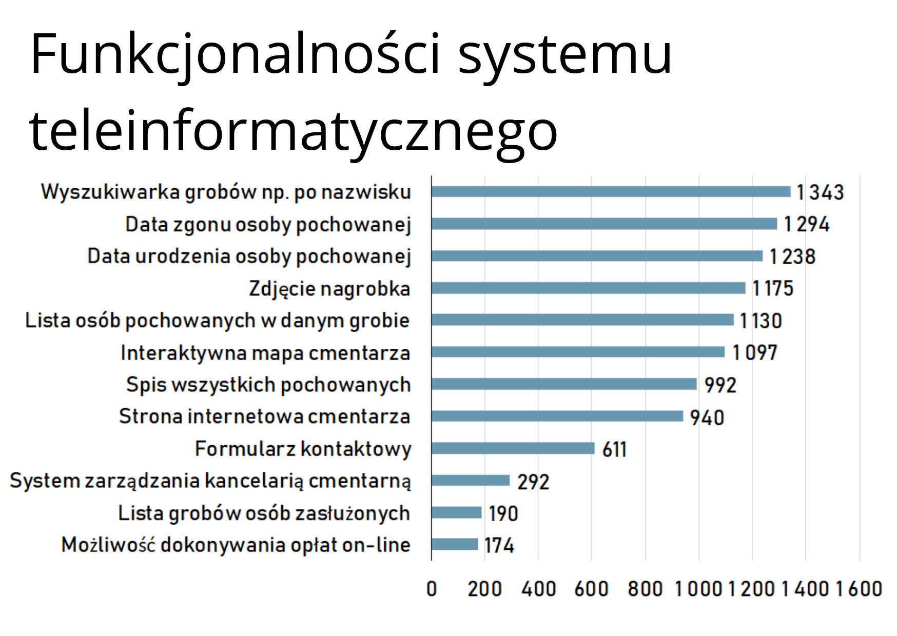 Respondencji zostali poproszeni także o wskazanie najistotniejszych finkcjonalności systemu teleinformatycznego do zarządzania cmentarzem. Wyszukiwarka grobów np. poprzez nazwisko była wskazywana najczęściej (Wykres 4).