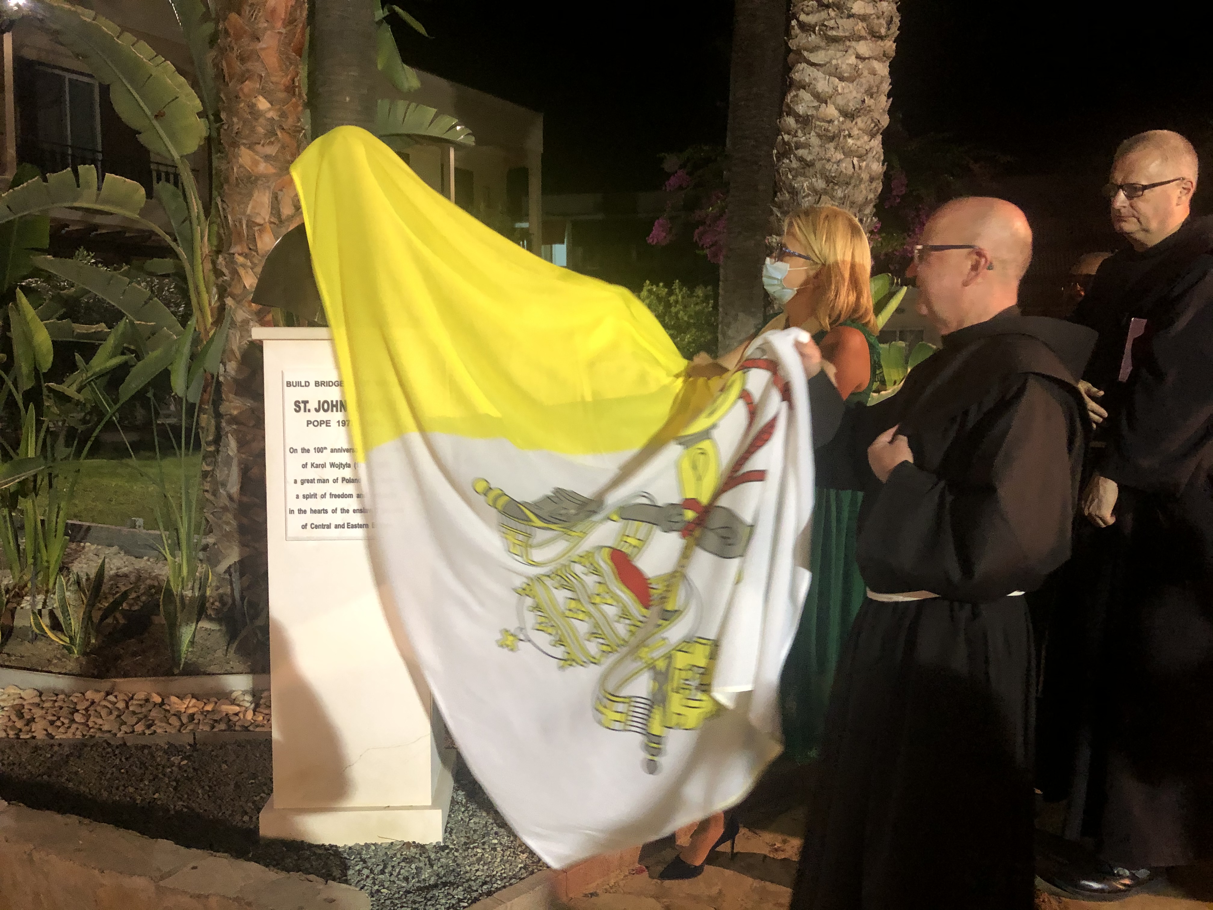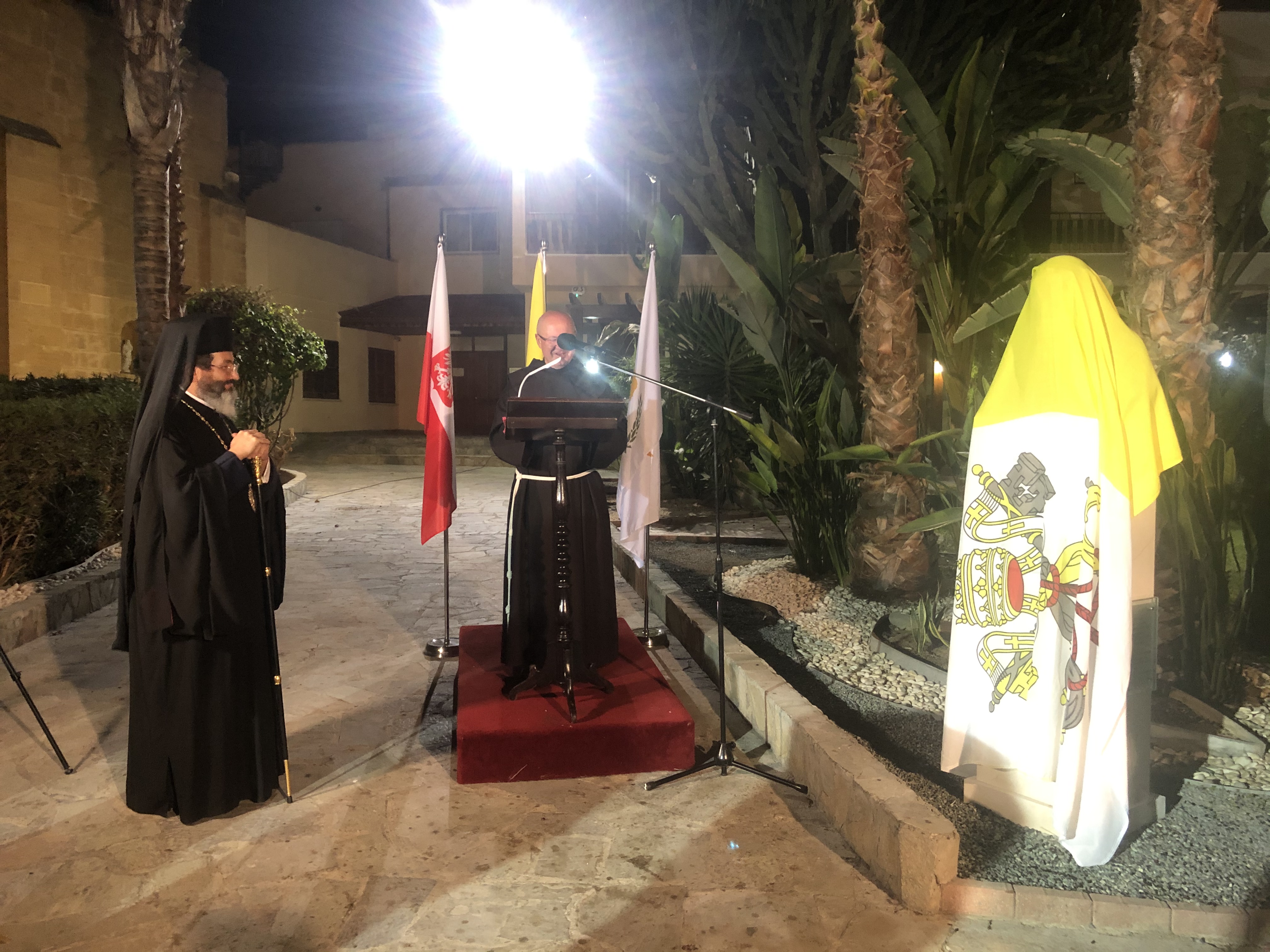 The monument was unveiled by the Ambassador of the Republic of Poland Mrs Irena Lichnerowicz-Augustyn and Father Jerzy Kraj, guardian of the Franciscan community in Nicosia and the local Attaché of the Apostolic Nunciature in Cyprus. The ceremony was preceded by a Holy Mass celebrated in the Holy Cross Church.