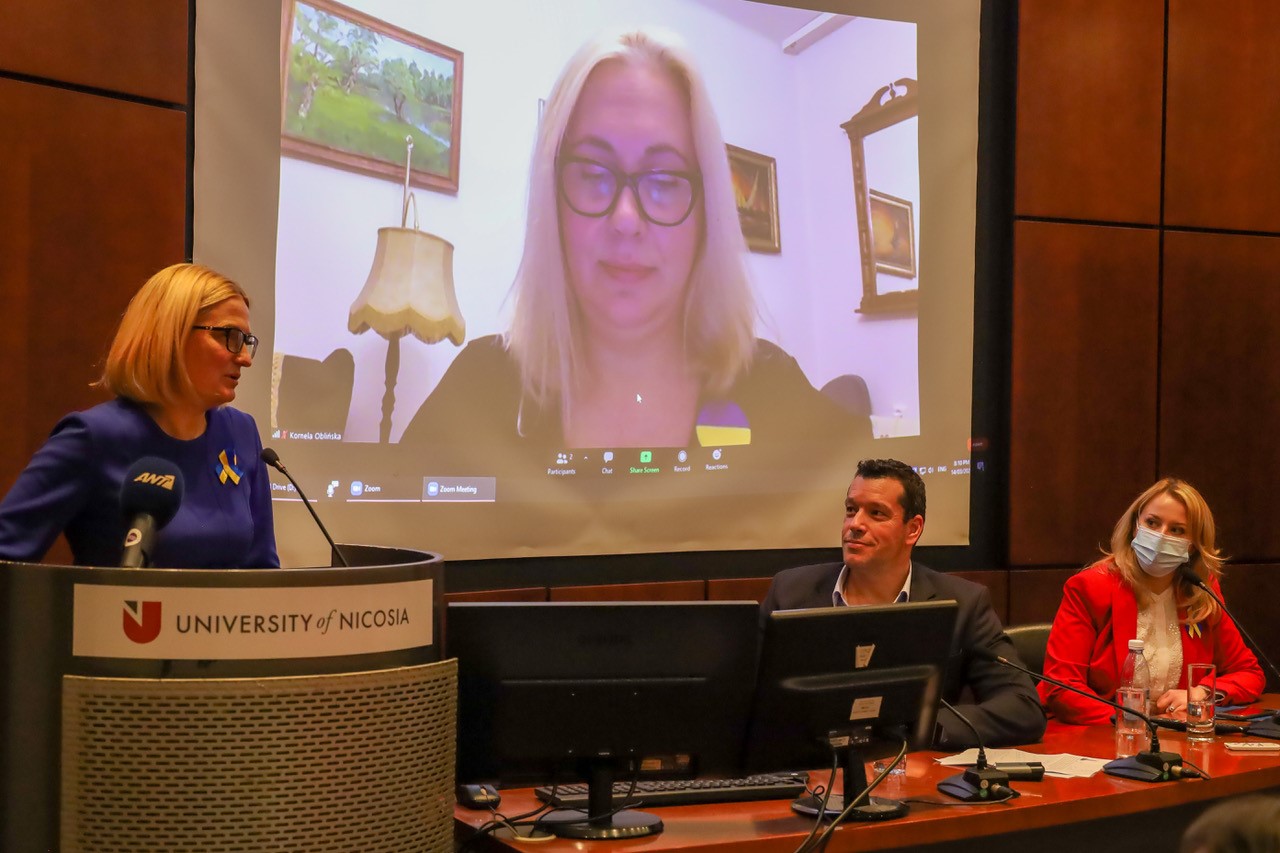 The guests were welcomed by the Rector of the University of Nicosia, prof. Philippos Pouyioutas and the Ambassador of the Republic of Poland to the Republic of Cyprus Mrs Irena Lichnerowicz-Augustyn. The opening address was delivered by senior vice-rector prof. Constantinos Phellas. In her speech, the Polish Ambassador referred to the ongoing invasion in Ukraine underlying Polish commitment and vast humanitarian aid provided to Ukrainian refugees. A minute of silence was held to honour the victims of Russian aggression.