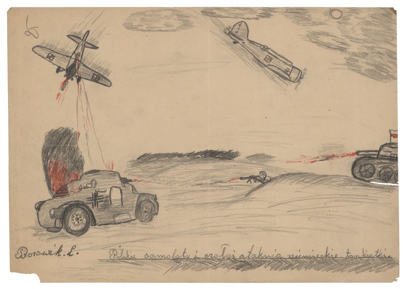 We present to you incredibly moving testimonies of war - from historical drawings of Polish children from 1946, which are a record of their experiences during World War II and the German occupation of 1939-1945, preserved in the Central Archives of Modern Records (AAN) in Warsaw, in the Ministry of Education complex from 1945-1966, and contemporary drawings of Ukrainian children, related to the war currently taking place in Ukraine, collected on the Mom, I See War portal. We aim to show that war always looks the same through the eyes of a child. Irrespective of place and time, it is a huge evil, and the child is always the victim of it. The similarity between historical and present-day drawings is striking. Children draw tanks, planes dropping bombs, fires, and explosions. They draw the injured and the dead, the ruined houses, the graves. They draw themselves and their family, they draw evacuation and escape. But they also draw hope and their dreams for the future. By putting images and words together in thematic groups: fighting, occupation, family, repression, resistance, destruction, victory-hope, we want to emphasise the fact of how similar the scenarios of the invading wars are. The time changes, the place changes, the child witnesses change, but the war is always the same: