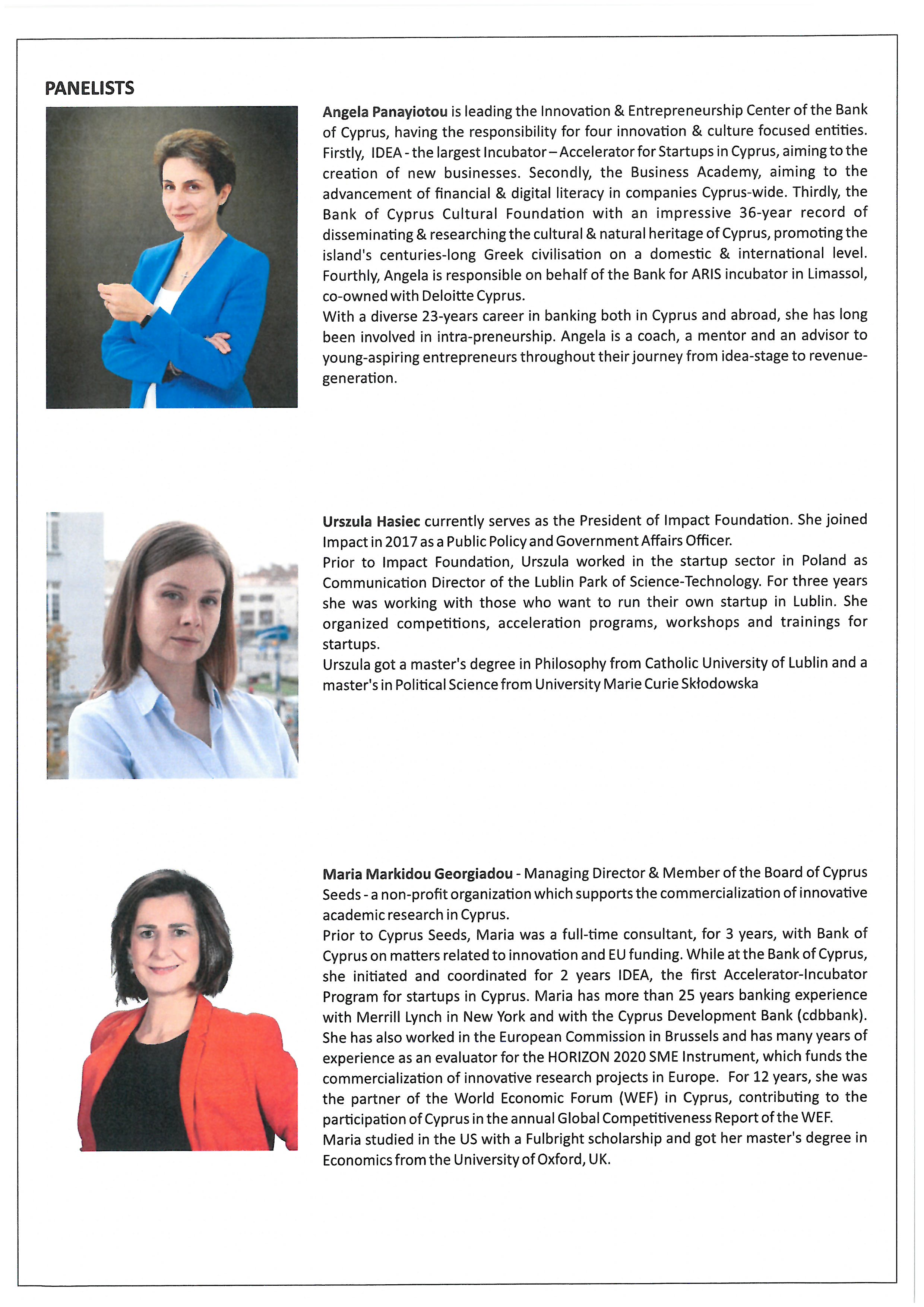 The panelists will be female experts in the field of entrepreneurship and science from Poland and Cyprus. Keynote speech will be delivered by Mr Kyriacos Kokkinos, Deputy Minister for Research, Innovation and Digital Policy of the Republic of Cyprus.