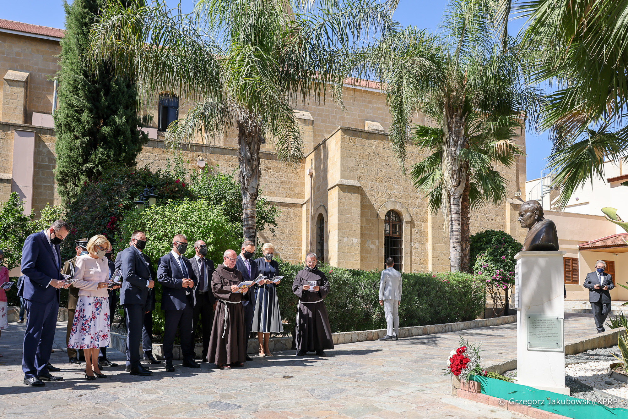 Then the Presidential Couple was received by the Leader of the Cypriot Orthodox Church, His Beatitude Archbishop Chrysostomos II. Subsequently, they visited the Catholic Church of the Holy Cross and laid a bouquet of flowers at the bust of St. John Paul II.