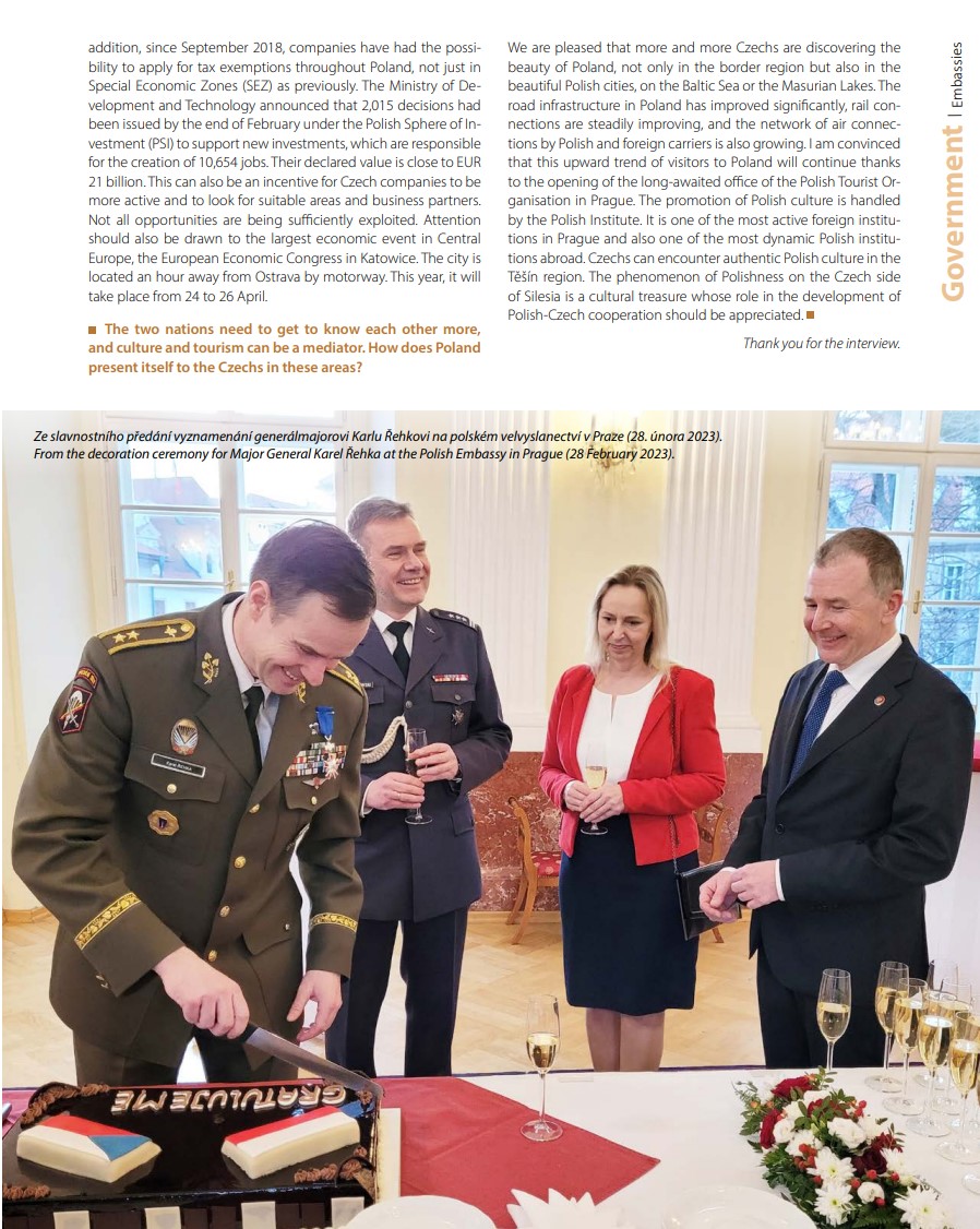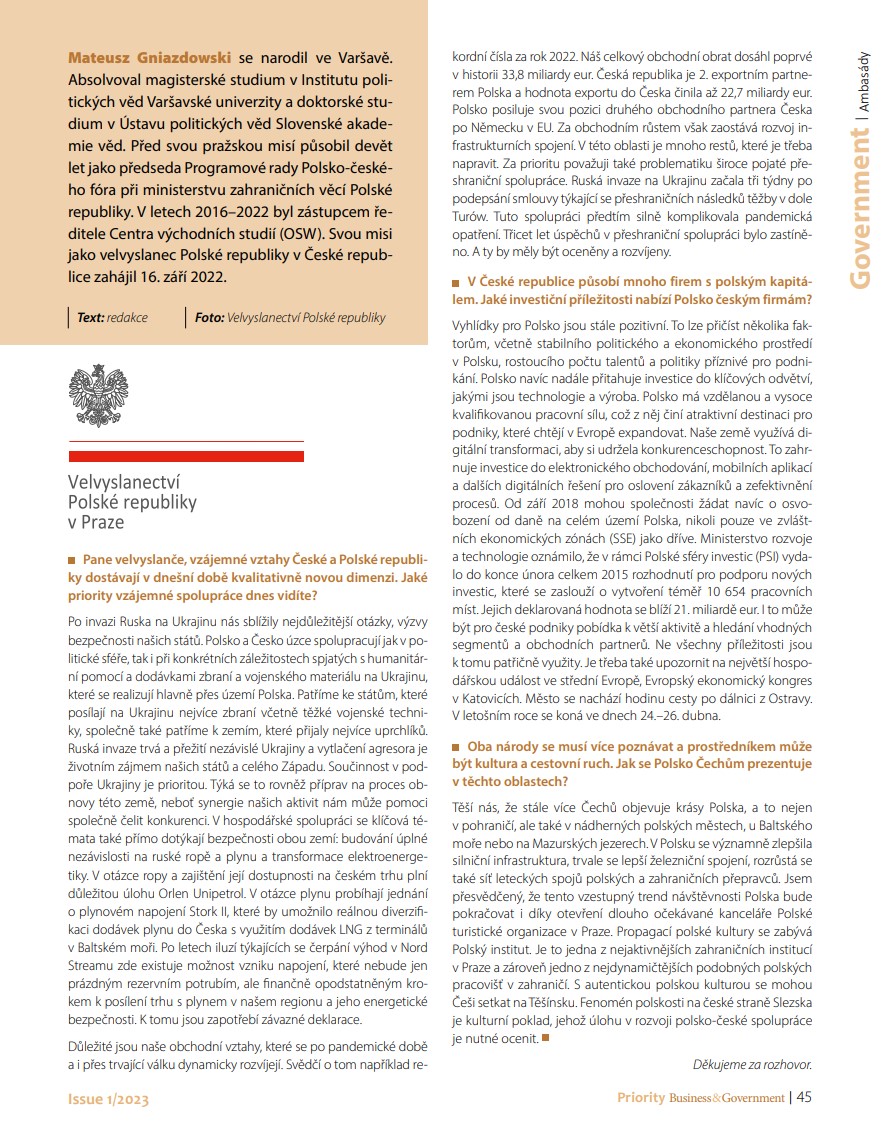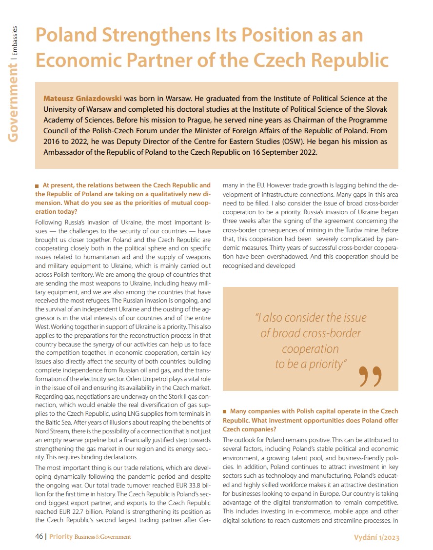 Ambasador Mateusz Gniazdowski w rozmowie opublikowanej w najnowszym numerze magazynu "Priority" przybliża stan i priorytety politycznej i gospodarczej współpracy polsko-czeskiej w kontekście rosyjskiej agresji na Ukrainę. Zaprasza też czeskie firmy do eksplorowania licznych możliwości inwestycyjnych w Polsce, a miłośników podróży i kultury zachęca do odwiedzenia nie tylko przygranicznych zakątków Polski, ale także skorzystania z coraz lepszej dostępności transportowej atrakcji położonych w głębi kraju.