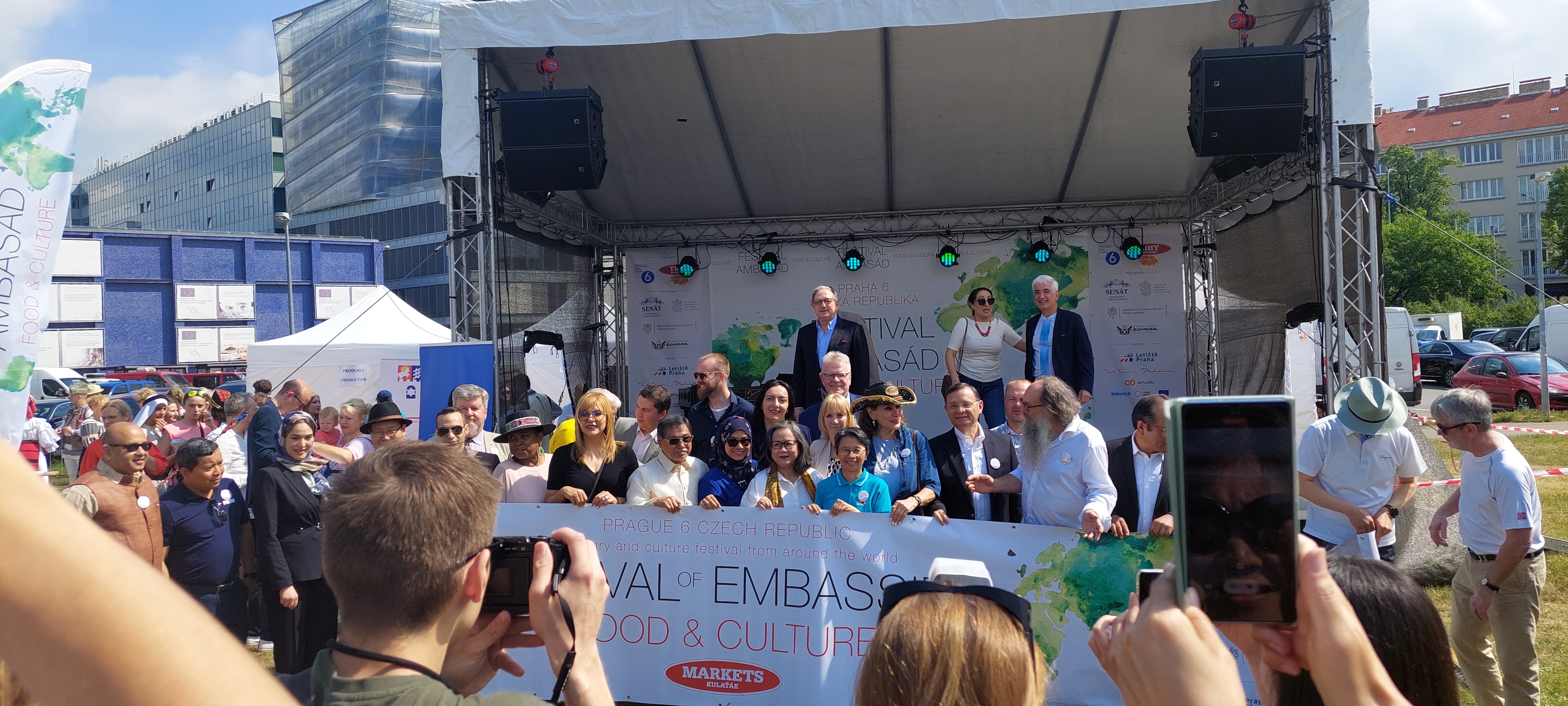 W dniu 4 czerwca br. w dzielnicy Praga 6 odbył się Festiwal Ambasad Food and Culture. Jest to cykliczne wydarzenie organizowane przez władze dzielnicy Praga 6, gdzie siedziby ma większość placówek dyplomatycznych. Tegoroczną edycję Festiwalu odwiedziło kilka tysięcy mieszkańców Pragi. Placówka wzięła udział w wydarzeniu promując polską kulturę, kuchnię i walory turystyczne. Wspólnie z ZBH PAIiH w Pradze placówka zorganizowała polskie stoisko, które oferowało dania polskiej kuchni, polskie produkty oraz informacje turystyczne o Polsce. Ponadto, na scenie muzycznej Festiwalu zaprezentowała się polska kapela Buraky. Koncert polskiej kapeli folkowej, wpisujący się w cykl wydarzeń w ramach #PLHeritageDays, był jednocześnie zwieńczeniem całodziennego programu towarzyszącego Festiwalowi Ambasad.