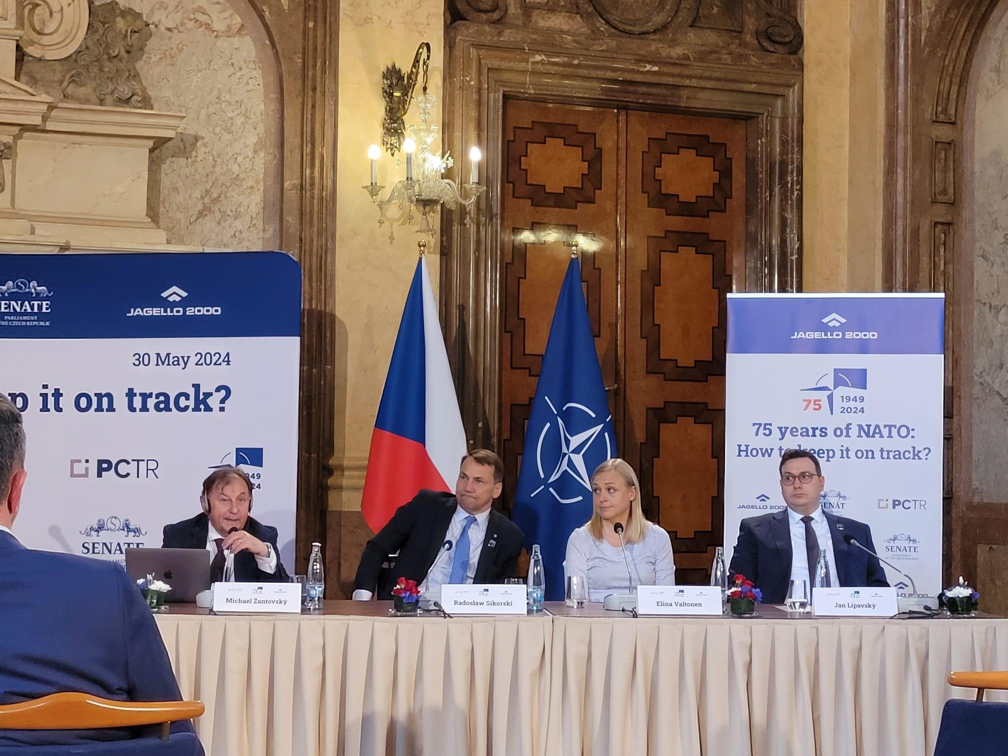 Przed nieformalnym spotkaniem ministrów spraw zagranicznych NATO, w siedzibie czeskiego Senatu odbyła się debata publiczna, w której wzięli udział minister Radosław Sikorski, minister spraw zagranicznych Czech Jan Lipavský i minister spraw zagranicznych Finlandii Elina Valtonen. Po dyskusji wystąpił z przemówieniem sekretarz generalny NATO Jens Stoltenberg. Gospodarzem spotkania był przewodniczący Senatu Parlamentu Republiki Czeskiej Miloš Vystrčil, współorganizatorem – stowarzyszenie Jagello 2000. Minister Sikorski wskazał, że pokój może zostać zaprowadzony na Ukrainie „w ciągu pięciu minut” – zależy to tylko od prezydenta Putina, który nakaże zakończenie walk i powrót wojsk rosyjskich za granice Ukrainy uznawane przez społeczność międzynarodową. Minister podkreślał też, że jeśli hybrydowe ataki rosyjskie będą się nasilać, konieczne będzie zaostrzenie działań przeciw Rosji. Z uznaniem wypowiedział się o czeskiej inicjatywie ograniczenia mobilności rosyjskich dyplomatów w obszarze Schengen, jako inspirującej polskie rozwiązania na szczeblu krajowym. Debata była transmitowana i relacjonowana przez czeską telewizję publiczną (ČT24) oraz media zagraniczne (m.in. Polsat, DW News). Polsko-czeskie aspekty przy okazji spotkania ministerialnego uwypuklił także wywiad z ministrem Sikorskim w kanale informacyjnym telewizji publicznej ČT24.