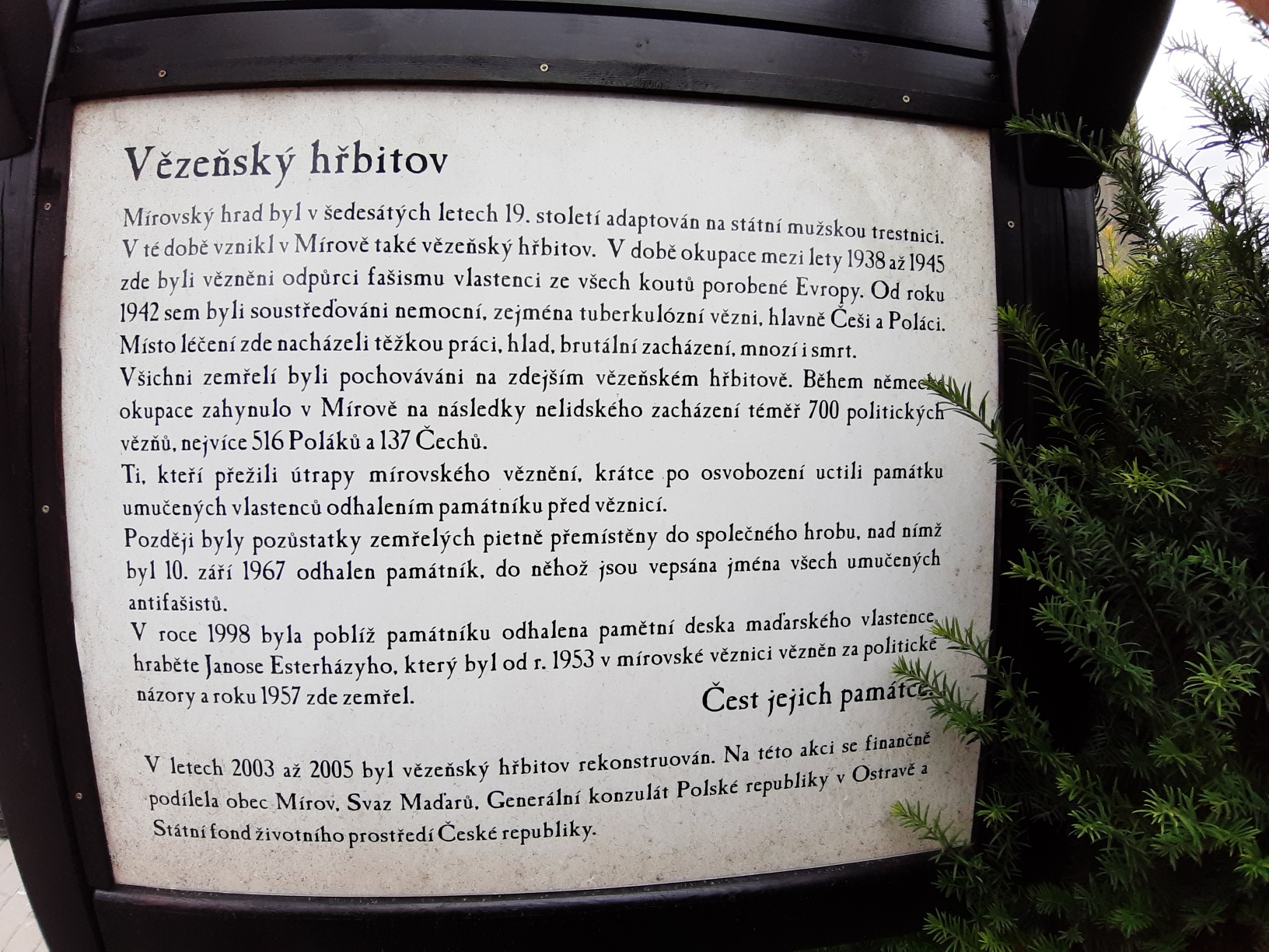 W 1938 r . więzienie w zamku w Mirovie przejęli niemieccy żołnierze, którzy zamienili je na pomocnicze więzienie brnieńskiego, prościejowskiego oraz ołomunieckiego gestapa. Po 1940 r. więzienie funkcjonowało jako „lecznica dla osób słowiańskiego pochodzenia chorych na płuca” gdzie nikogo nie leczono, lecz skazywano na powolną śmierć. W okresie okupacji w Mirovie zmarło 670 osób, w tym 516 Polaków i 137 Czechów. Pod koniec 1966 r. zadecydowano o likwidacji cmentarza i ekshumacji szczątków, które zostały umieszczone we wspólnej mogile nad którą został umieszczony pomnik, uroczyście odsłonięty 14 września 1967 r.
