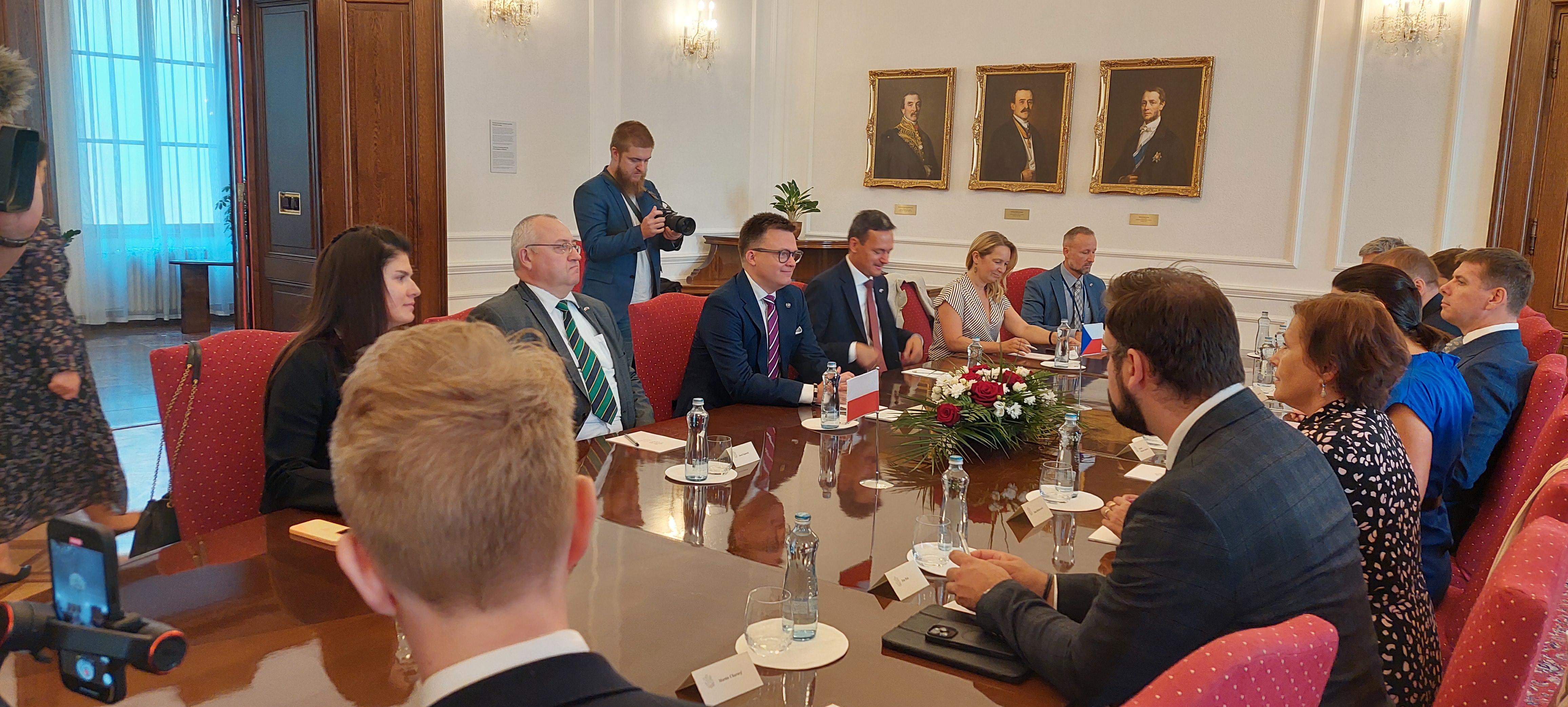 W dniach 29 – 30 sierpnia 2024 r. marszałek Sejmu Rzeczypospolitej Polskiej Szymon Hołownia przebywał z oficjalną wizytą w Republice Czeskiej. Głównymi punktem jego wizyty były rozmowy dwustronne z przewodniczącą Izby Poselskiej Markétą Pekarovą Adamovą i przewodniczącym Senatu Milošem Vystrčilem. Ich tematyka koncentrowała się wokół dwustronnej współpracy parlamentarnej, perspektyw parlamentarnego wymiaru V4 oraz wsparcia dla Ukrainy. Marszałek Szymon Hołownia został także przyjęty przez prezydenta Republiki Czeskiej Petra Pavla. Wraz z przewodniczącą Markétą Pekarovą Adamovą oraz przewodniczącymi parlamentu Estonii i Senatu Rumunii wziął udział w panelu konferencji GLOBSEC Forum 2024 poświęconemu stanowi demokracji w Europie.