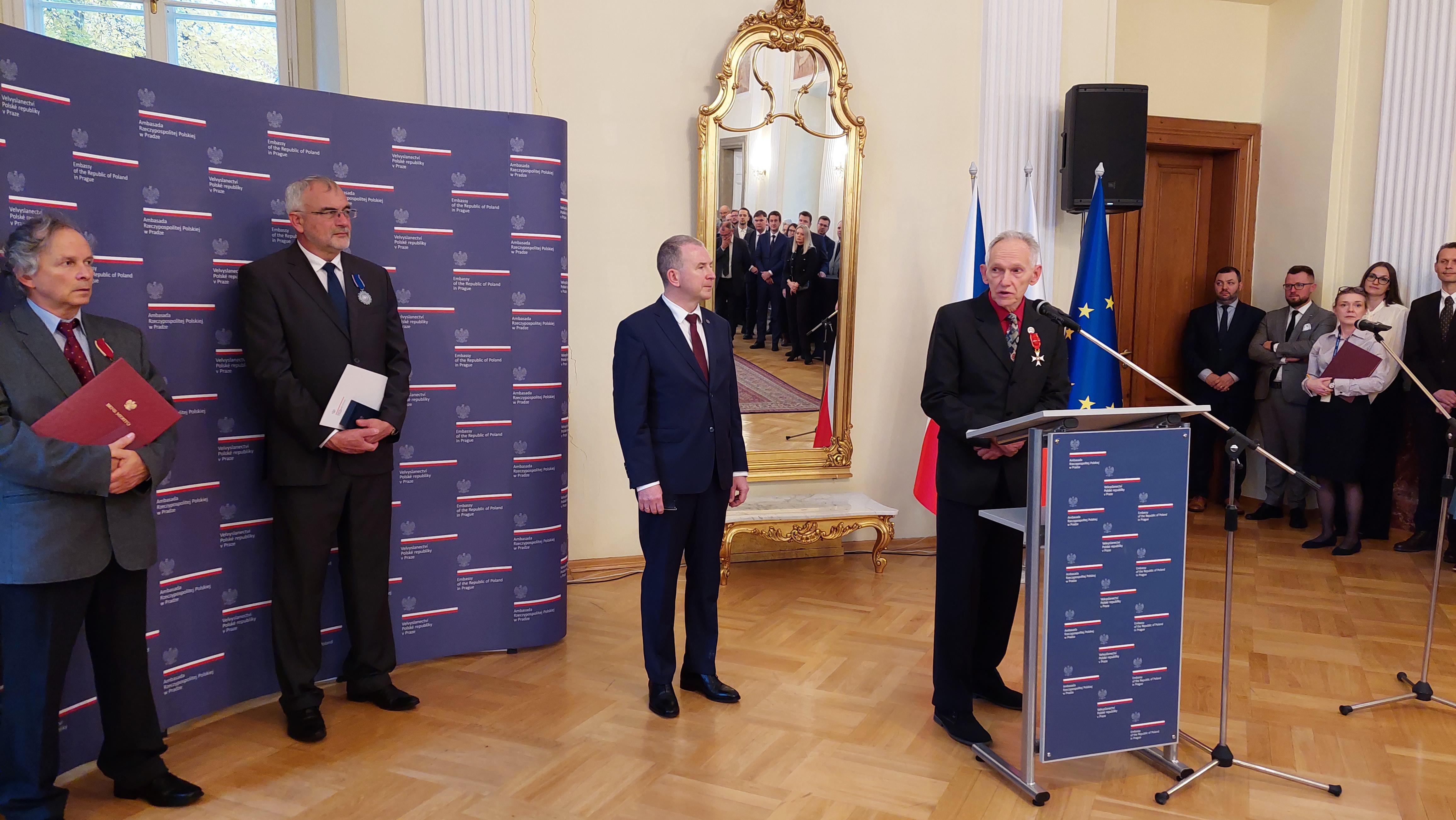 W Ambasadzie RP w Pradze 15 listopada odbyło się przyjęcie z okazji Narodowego Święta Niepodległości dla przedstawicieli społeczności polskiej w RCz, połączone z uroczystością wręczenia orderu i odznaczeń. Ambasador RP udekorował Krzyżem Oficerskim Orderu Odrodzenia Polski pana Antoniego Matuszkiewicza, zamieszkałego w Martínkovicach k. Broumova poetę, byłego działacza dolnośląskiej „Solidarności”, odznaczonego postanowieniem Prezydenta RP za wybitne zasługi w działalności na rzecz przemian demokratycznych w Polsce. Odznakę honorową Bene Merito, nadaną przez Ministra Spraw Zagranicznych za działalność wzmacniającą pozycję Polski na arenie międzynarodowej otrzymał pan Krzysztof Nowak – profesor Uniwersytetu Śląskiego, historyk i badacz dziejów polskiej społeczności na Zaolziu, członek Rady Programowej Forum Polsko-Czeskiego przy Ministrze Spraw Zagranicznych. Srebrny medal „Zasłużony dla Nauki Polskiej Sapientia et Veritas” nadany przez Ministra Edukacji i Nauki otrzymał pan Petr Mrkývka – docent Wydziału Prawa Uniwersytetu Masaryka, Konsul Honorowy Rzeczypospolitej Polskiej w Brnie. Medal Komisji Edukacji Narodowej, nadany przez Ministra Edukacji i Nauki, otrzymała pani Agata Vlasáková – wieloletnia dyrektor Szkoły Polskiej im. Św. Jadwigi w Pradze (z przyczyn zdrowotnych medal odebrał syn).