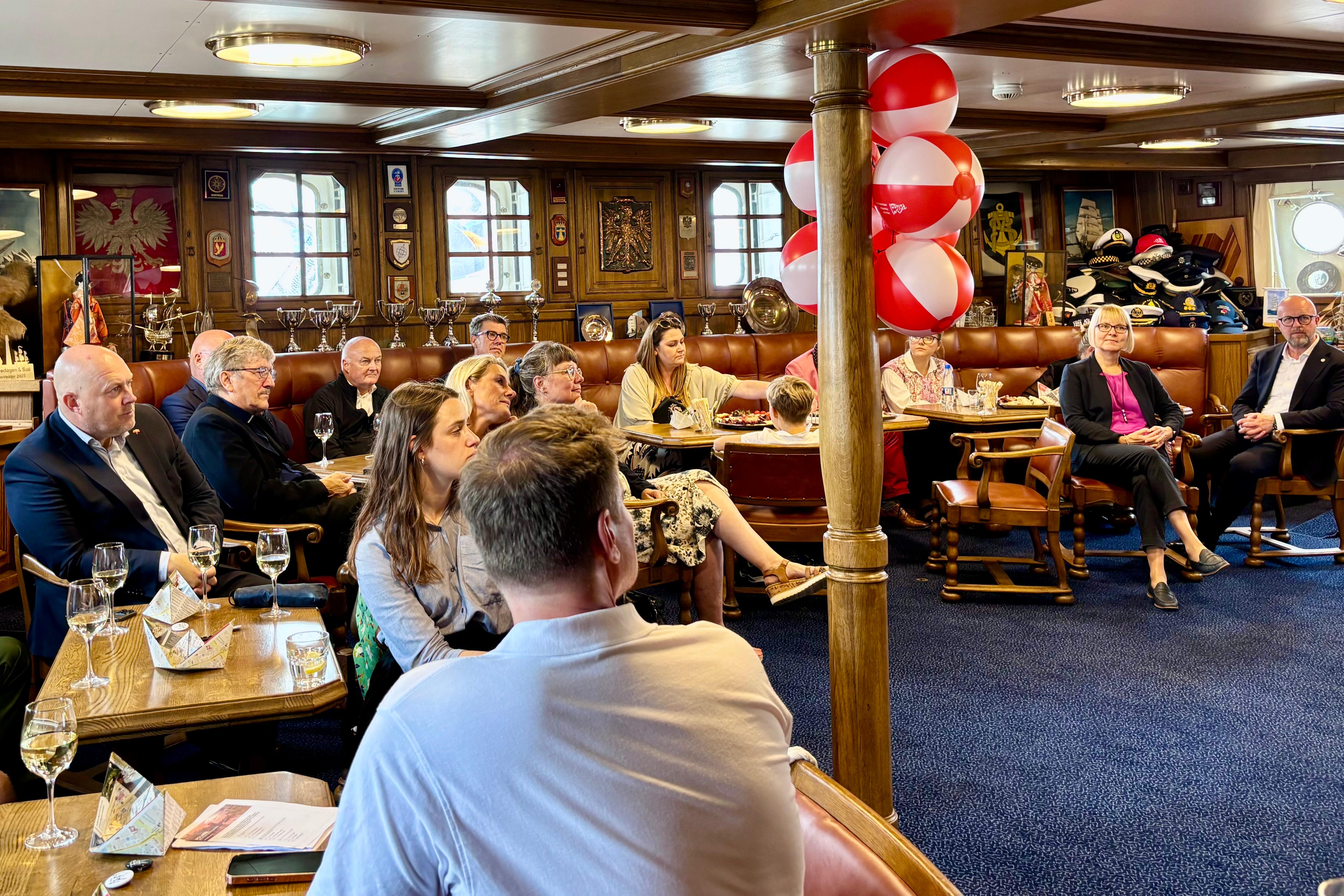 Zakończenie regat stało się także okazją do upamiętnienia wyjątkowej rocznicy – 400-lecia utworzenia pierwszego duńskiego przedstawicielstwa w Gdańsku. Z tej okazji nasza placówka zorganizowała na pokładzie Daru Młodzieży mała uroczystość w obecności przyjaciół z Danii. Wśród gości zaproszonych przez Kierownik Placówki Ewę Dębską byli przedstawiciele władz lokalnych, środowisk biznesowych oraz partnerzy współpracujący z polskimi instytucjami. Podczas wydarzenia odczytany został list Prezydent Gdańska, Aleksandry Dulkiewicz, w którym podkreśliła trwałość więzi łączących Gdańsk z Danią oraz wielowiekową historię współpracy naszych narodów.