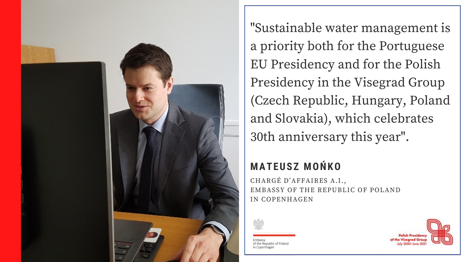 Otwierając wydarzenie chargé d’affaires a.i. Mateusz Mońko zwrócił uwagę, że zrównoważone zarządzanie zasobami wodnymi to priorytet, który łączy portugalską prezydencję w Radzie UE oraz polską prezydencję w Grupie Wyszehradzkiej, ugrupowaniu obchodzącym w tym roku 30-lecie.