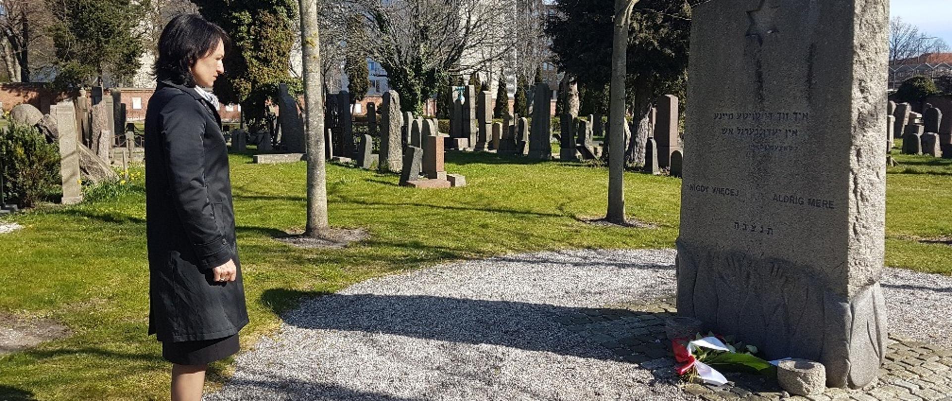 On the occasion of the 77th anniversary of Warsaw Ghetto Uprising Ambassador Henryka Mościcka Dendys commemorated the heroes of the uprising laying flowers at the monument of Holocaust Victims at the Jewish Venstre Kirkegård in Copenhagen.