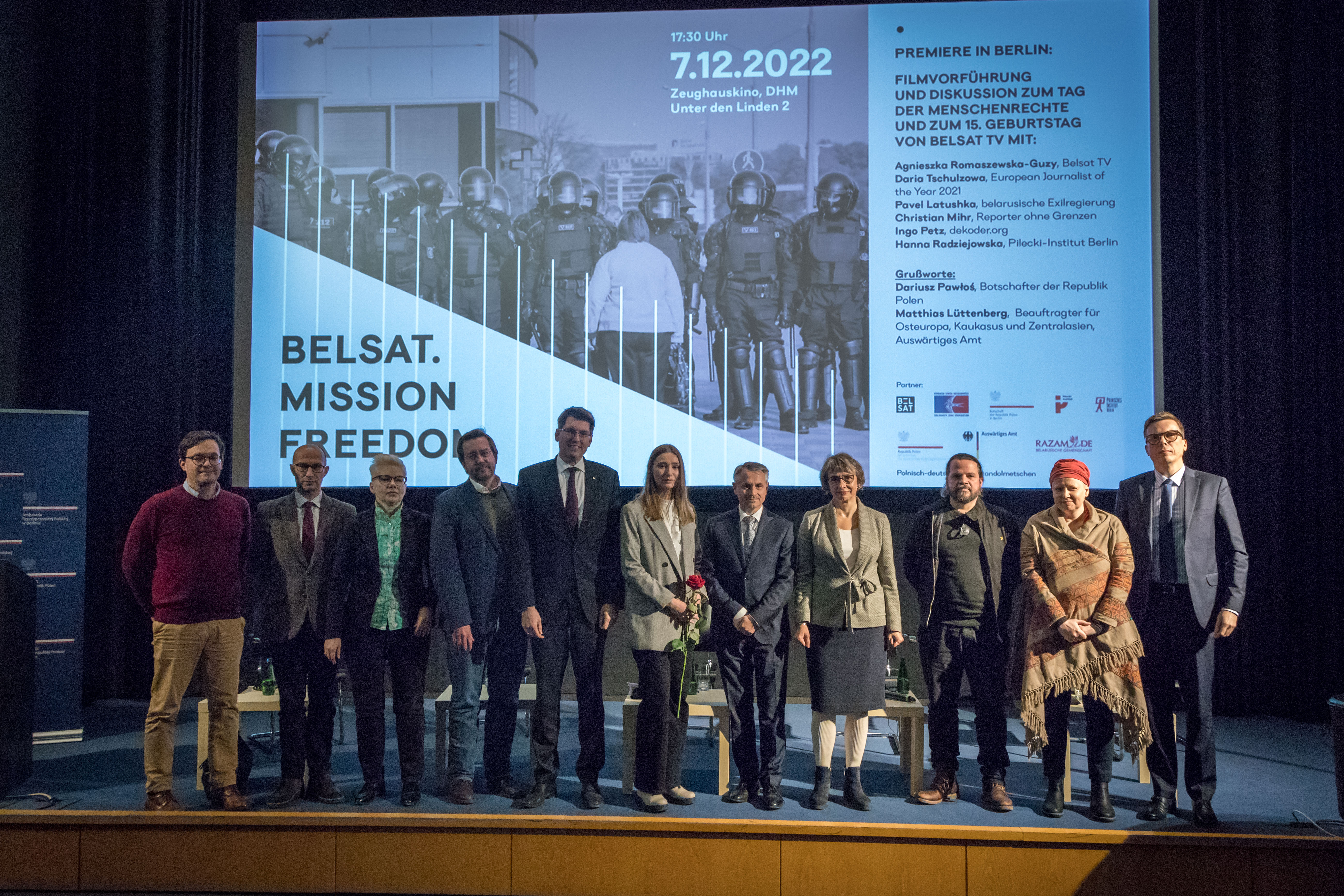 Vor der Vorführung hielten Dariusz Pawłoś, Botschafter der Republik Polen, und Matthias Lüttenberg, Bevollmächtigter für Osteuropa, den Kaukasus und Zentralasien im Auswärtigen Amt, ihre Ansprachen. Im Anschluss an den Film fand eine Podiumsdiskussion statt, an der folgende Personen teilnahmen: Agnieszka Romaszewska-Guzy - Direktorin von Belsat, Daria Czulcowa - 25-jährige Belsat-Journalistin, die zu zwei Jahren Gulag verurteilt wurde und mit dem PRIX EUROPA "Europäischer Journalist des Jahres 2021" ausgezeichnet wurde, Christian Mihr - Leiter des deutschen Zweigs von Reporter ohne Grenzen und Ingo Petz - Gründer des Wissensportals über Belarus und Russland www.dekoder.org. Moderiert von Hanna Radziejowska - Direktorin des Pilecki-Instituts in Berlin.