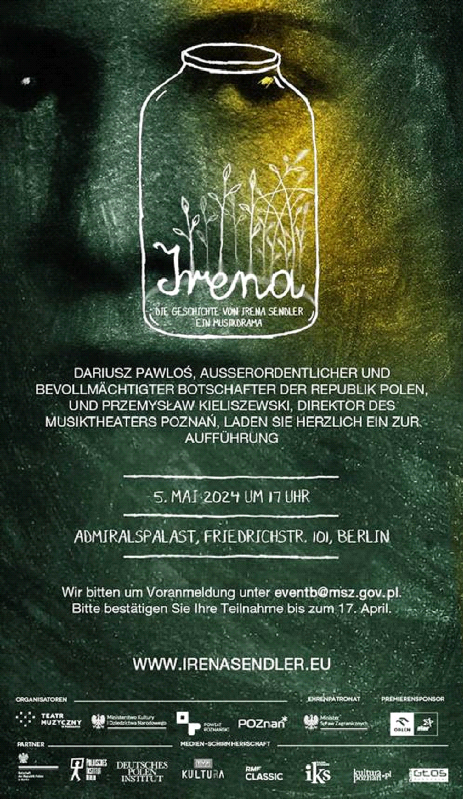 Wir laden Sie herzlich zu der Aufführung, die am 5. Mai 2024 um 17:00 im Admiralspalast in Berlin stattfindet. „Irena“, präsentiert vom Musiktheater in Poznań, ist eine musikalische Geschichte von Irena Sendler, die im Zweiten Weltkrieg mehrere hundert Kinder aus dem Warschauer Getto rettete.